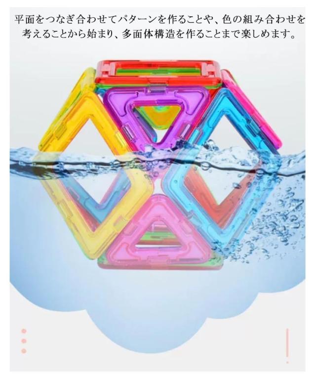 | 【商品名】知育玩具 【入数】収納ケース付き(約148ピース入り) 【素材】ABS 磁石 【特徴】表現力・認識力・想像力・思考力を引き出し、遊びと教育が同時にできる知育マグネットブロックです。カラフルな配色は幼児の色彩感覚を伸ばすことができます。平面をつなぎ合わせてパターンを作ることや、色の組み合わせを考えることから始まり、多面体構造を作ることまで楽しめます。色んな形・組み合わせは自由!!お子様の自由な発想・思想を育てちゃおう 誕生日、クリスマス、入園祝い、入学祝い、新年などに子供へのプレゼントとしては最適です。 | |
