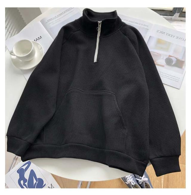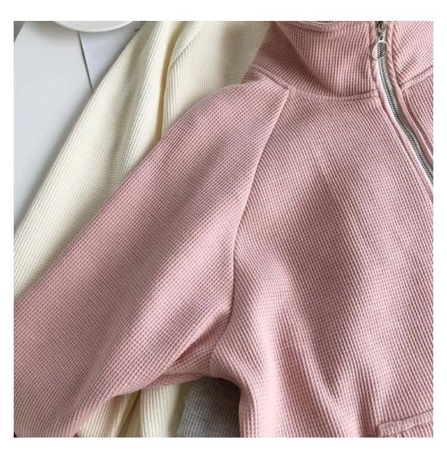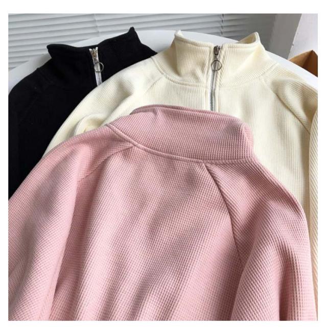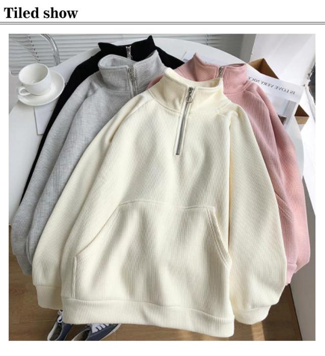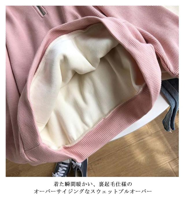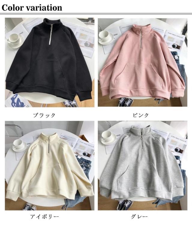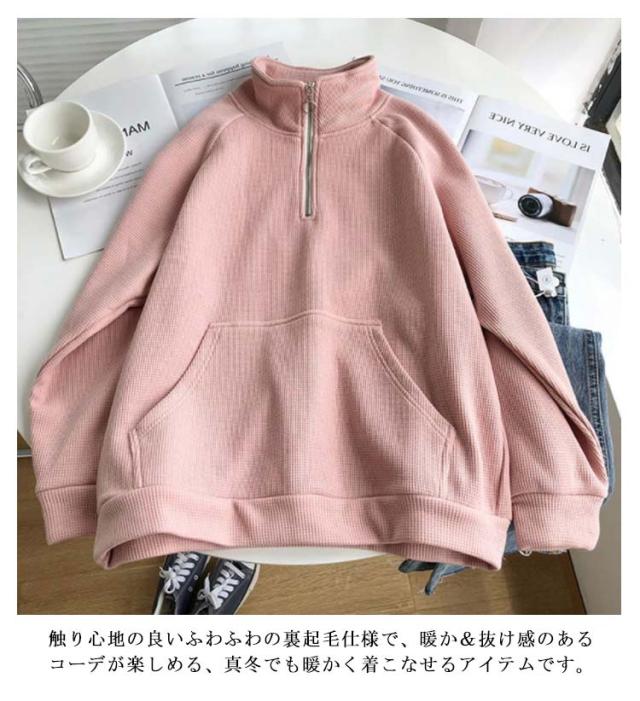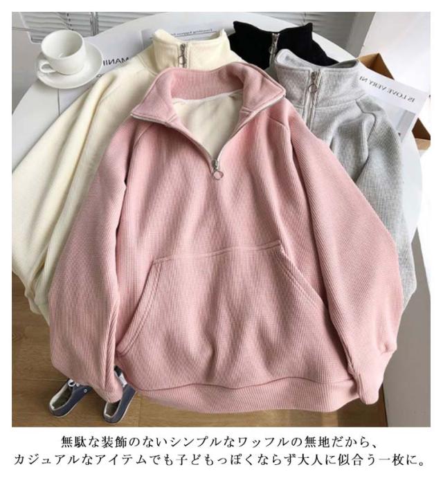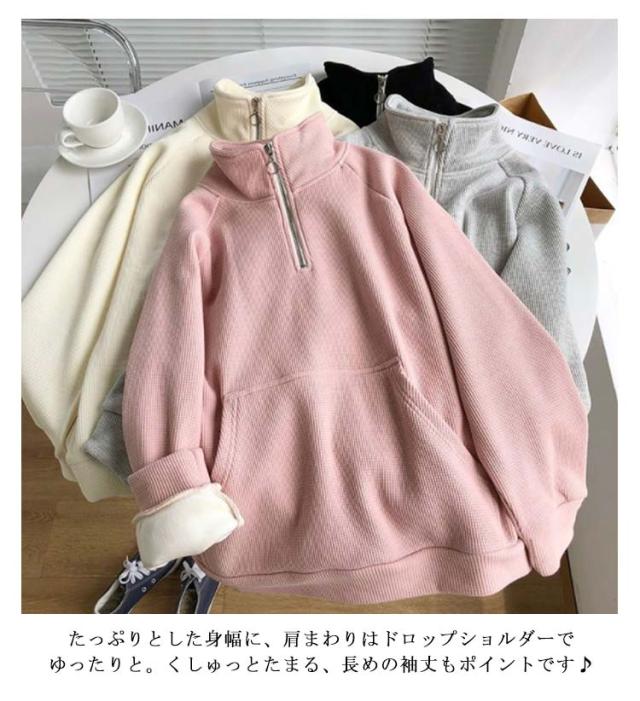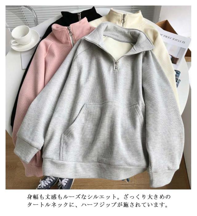 裏起毛 トレーナー ハーフジップ スウェット レディース トップス 長袖 タートルネック ワッフル パーカー プルオーバー 大きいサイズ ゆったり 冬 裏起毛 ボリュームスウェット スエット 暖かい 防寒 ブラック グレー アイボリー ピンク