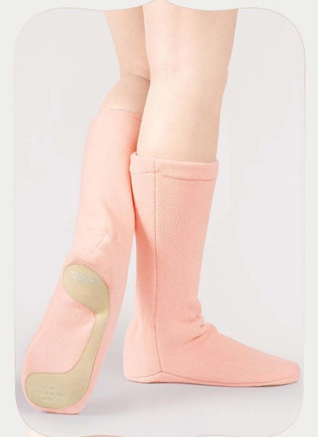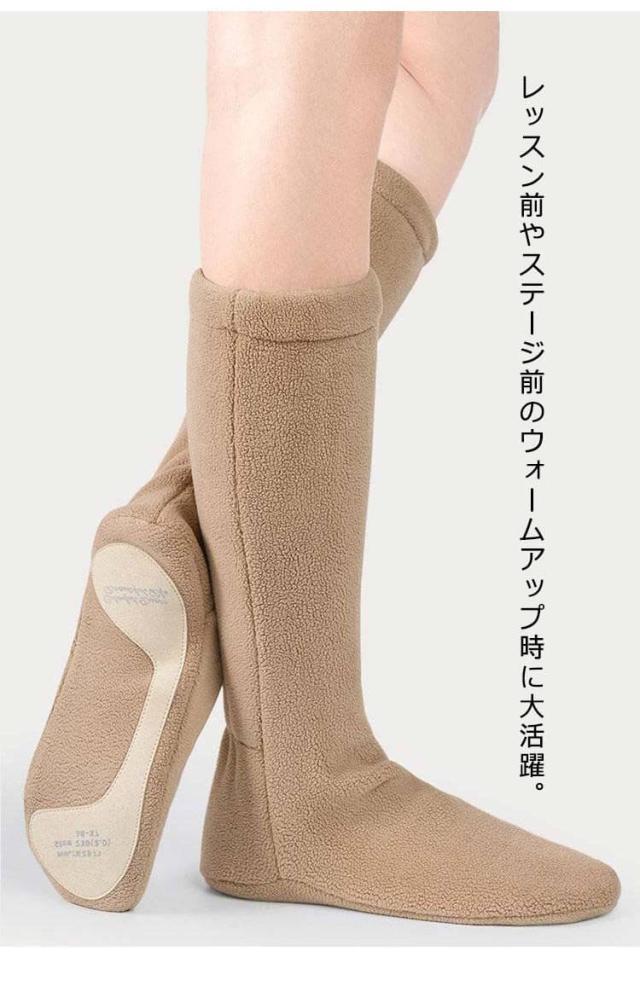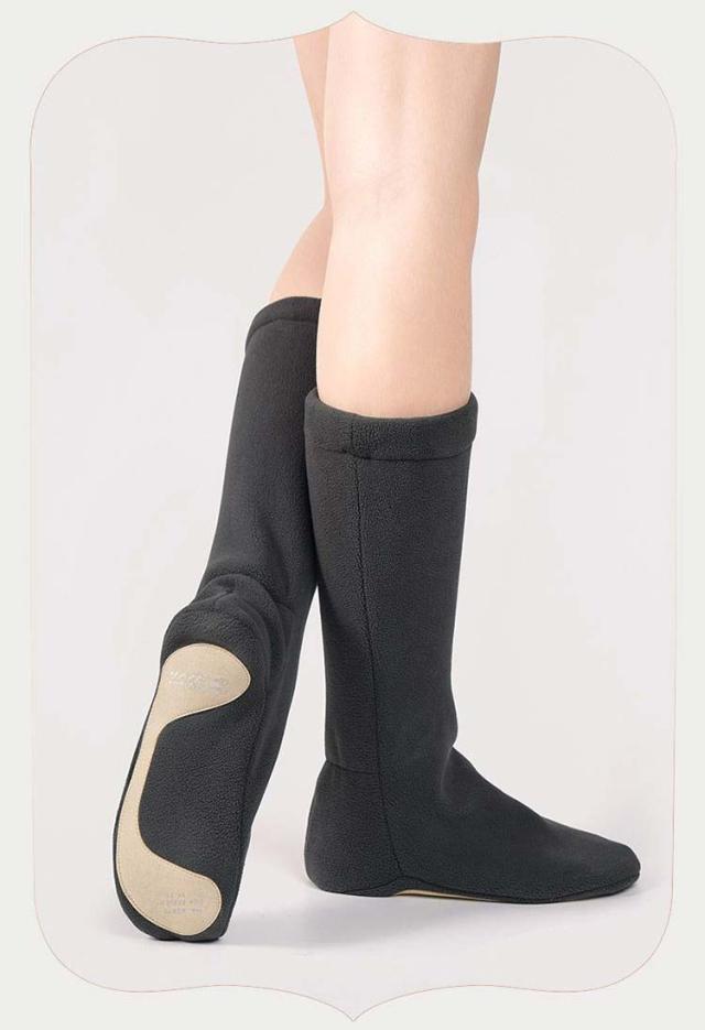 | 足首をあたためられる、ブーツタイプのウォームアップシューズ。 内側も外側もフリース素材が柔らかく、靴下のように足にフィットし軽いのにあたたか! 履き口は伸縮可能、熱を逃がしにくい仕様になっています。 ソールにはすべり止めレザー付き、安心です。 レッスン前やステージ前のウォームアップ時に大活躍。 室内でも足首が冷えて困っている方には、ルームシューズとしてもOK。 舞台・発表会を控えた方へのプレゼントにも、お勧めです。 | |