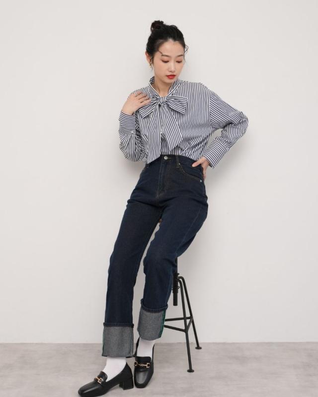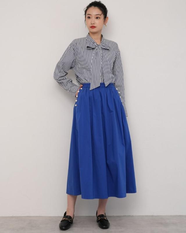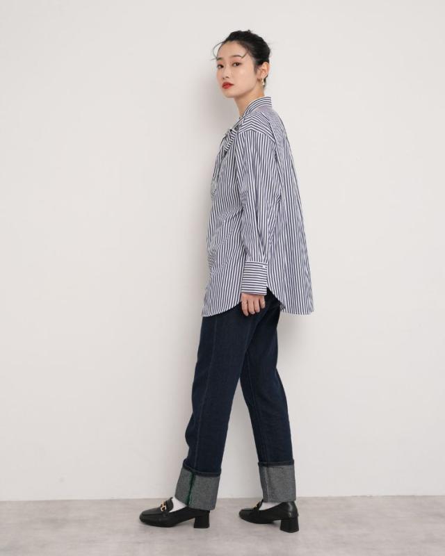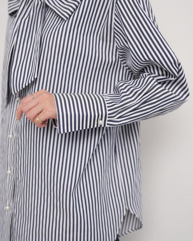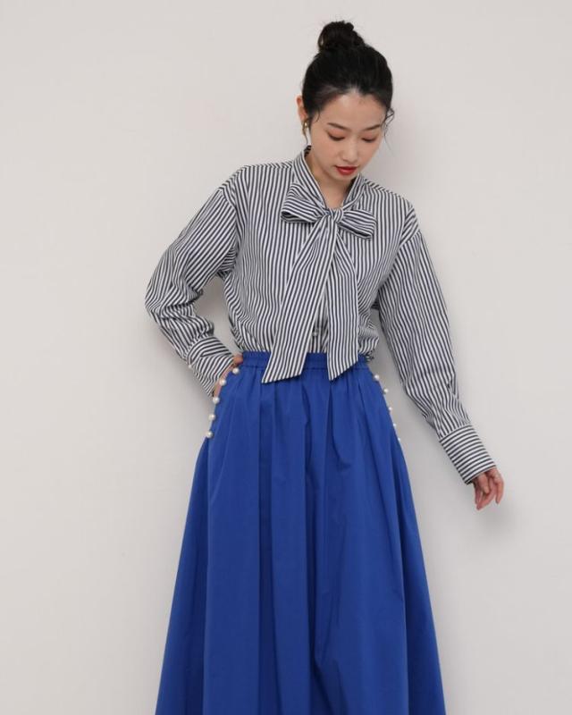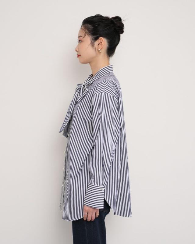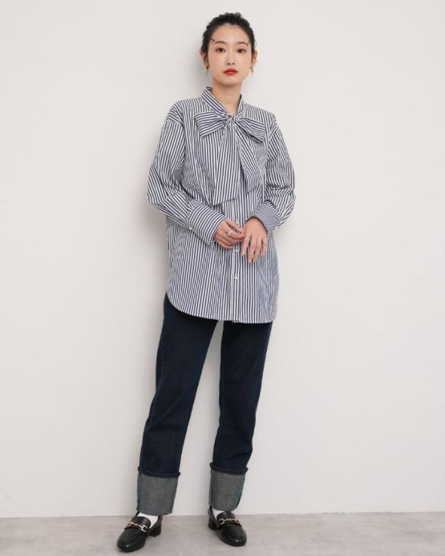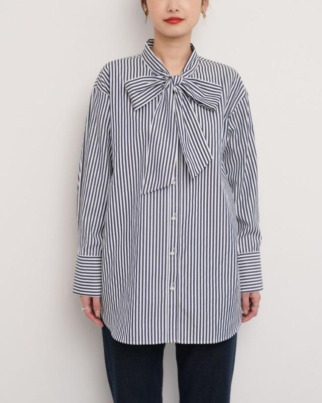 春に1枚でも目を引くストライプのボウタイシャツ。