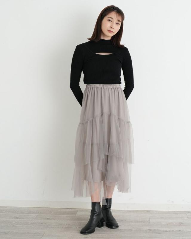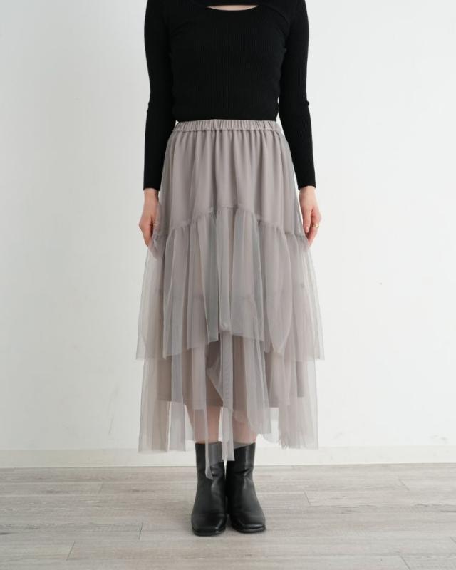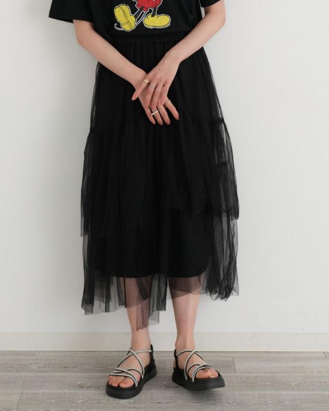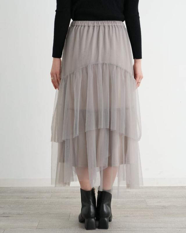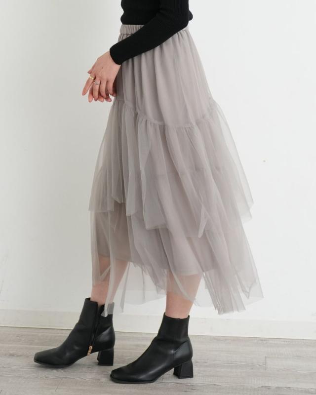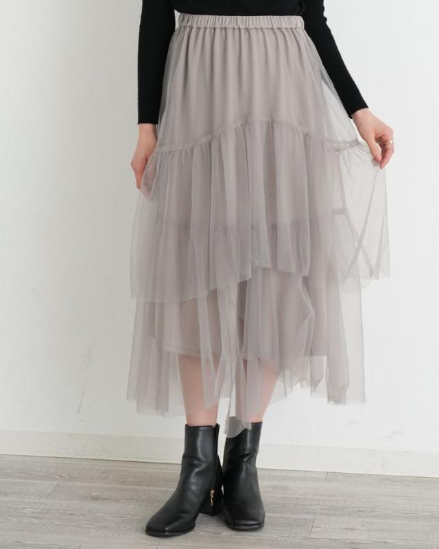 チュールを贅沢に使用しティアード部分をアシメにすることで 上品で華やかな1着に仕上げました! キレイめのトップスやカジュアルなTシャツと合わせても◎ 気分に合わせてコーディネートを楽しんで頂けます。