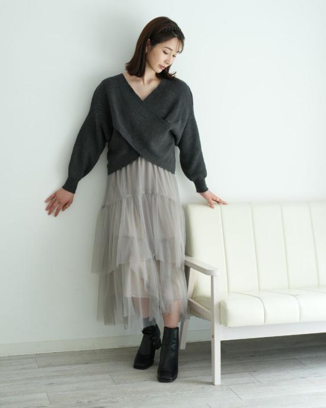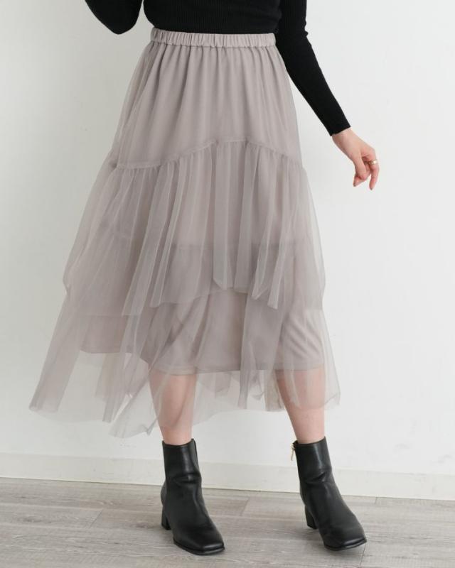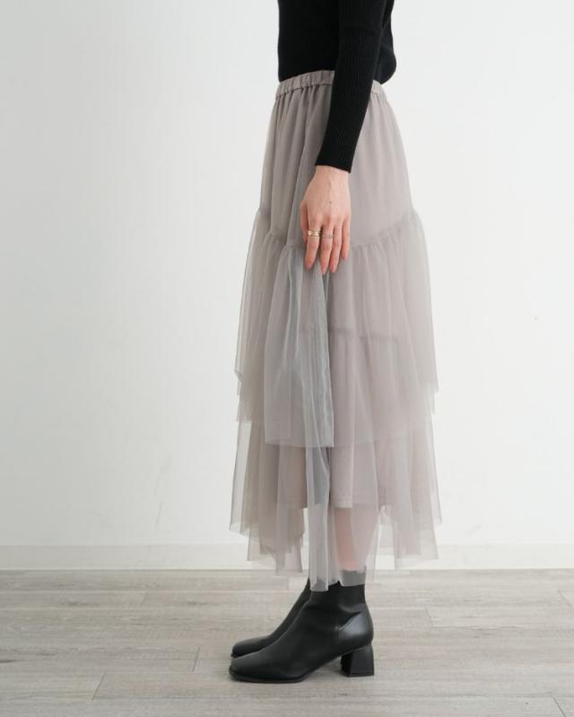 透け感のあるオーガンチュールを重ねたエアリー感のあるティアードスカート。