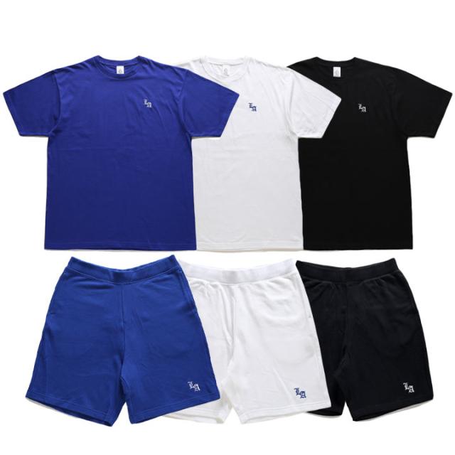 「Los Angeles」の頭文字にあたる「LA」をワンポイントでドロップしたTシャツとスウェットハーフパンツの上下セット。