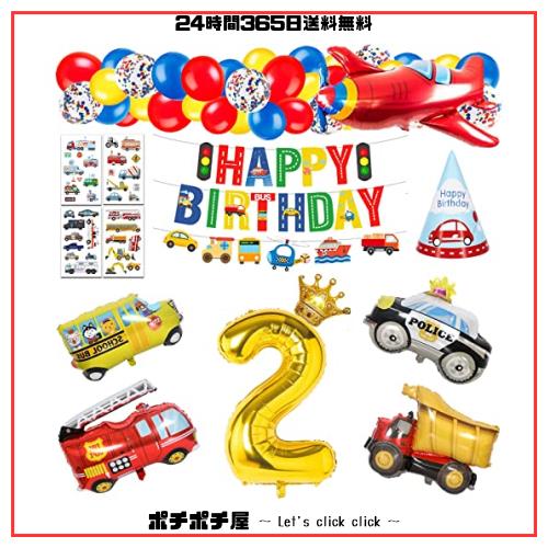 【セット内容】? 90cm 数字 2 バルーン ? 5個のホイルバルーン(トラック×1、飛行機×1、スクールバス×1、パトカー×1、消防車×1、王冠×1) ? 紙吹雪風船×4 ? ゴム風船×24(黄、青、赤) ? 1セットお誕生日おめでとうバナー ? 車ステッカー×2 ? 小道具キット(リボンひも、両面テープ、バルーンチェーン) ? 三角帽子×1