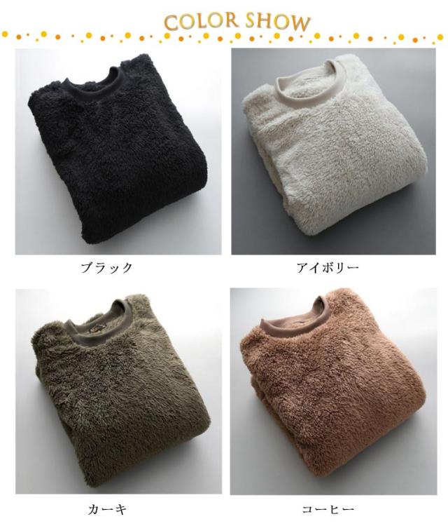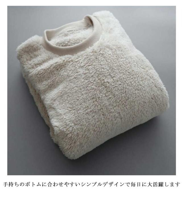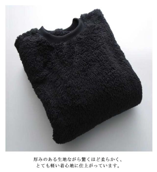 | モコモコとした質感がくせになるボアトレーナー。 裏面はもこもこボア素材。寒い時期でもあたたかく着こなせます。 厚みのある生地ながら驚くほど柔らかく、とても軽い着心地に仕上がっています。 起毛素材なのに着膨れして見えないのも◎この質感、この軽さ、この暖かさ、一度着たら絶対に手放せません★ 手持ちのボトムに合わせやすいシンプルデザインで毎日に大活躍します | |