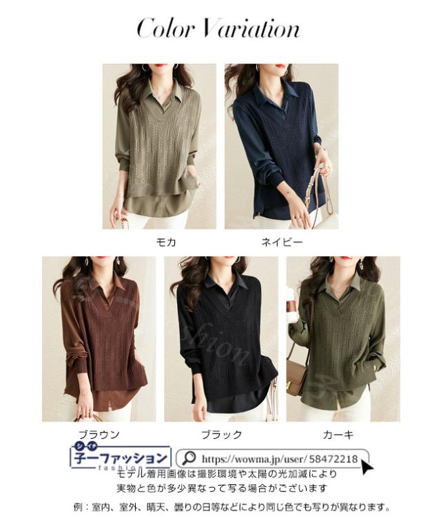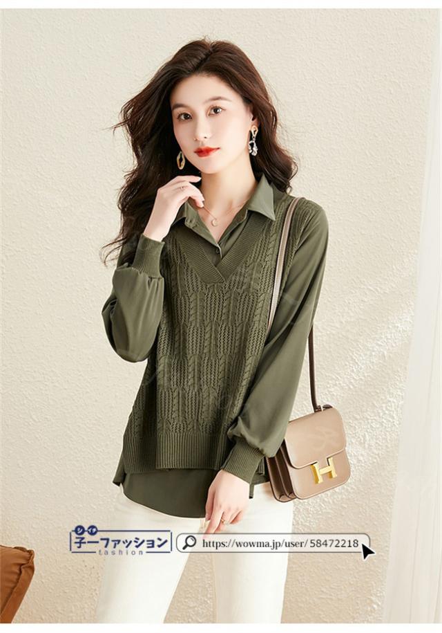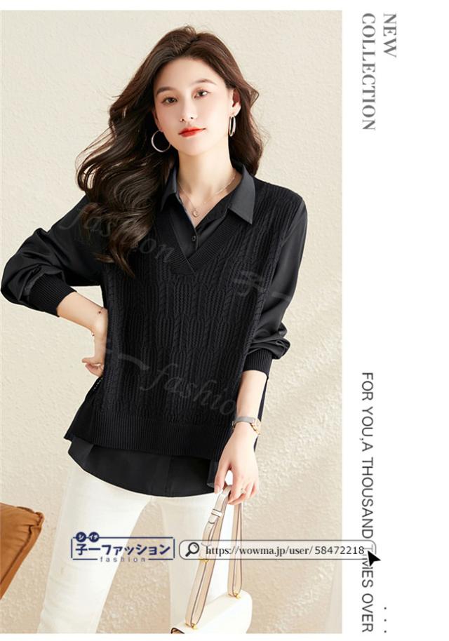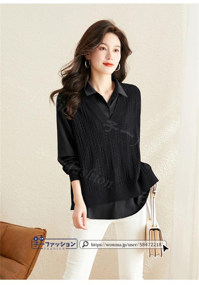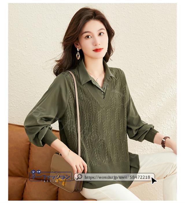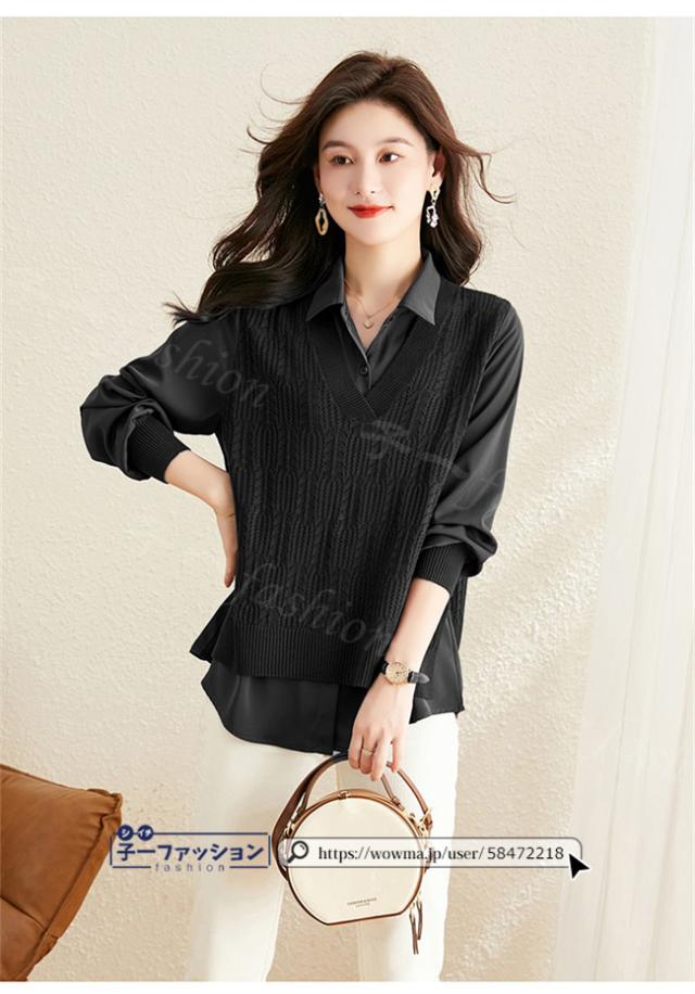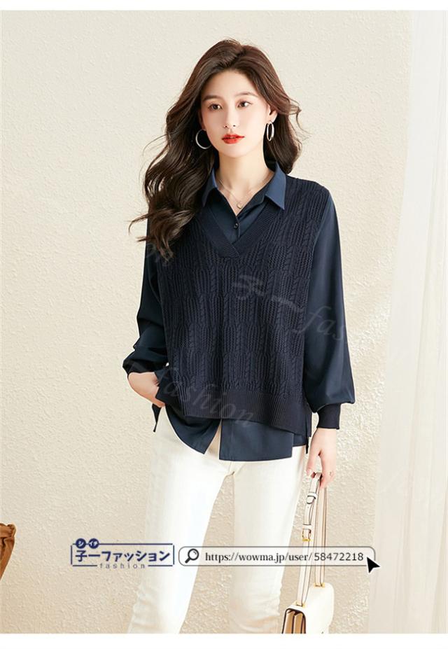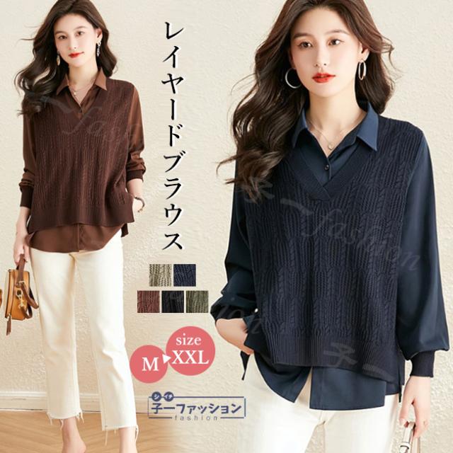 ブラウス 冬新作 長袖 レディース トップス レイヤード風 重ね着 プルオーバー 異素材 ニット 楽ちん オフィス シャツ チュニック 春夏 無地 シンプル 体型カバー きれいめ かわいい 洗える 気軽 手軽 通勤 春 秋 ゆったり ギフト 冬新作 春服 秋冬