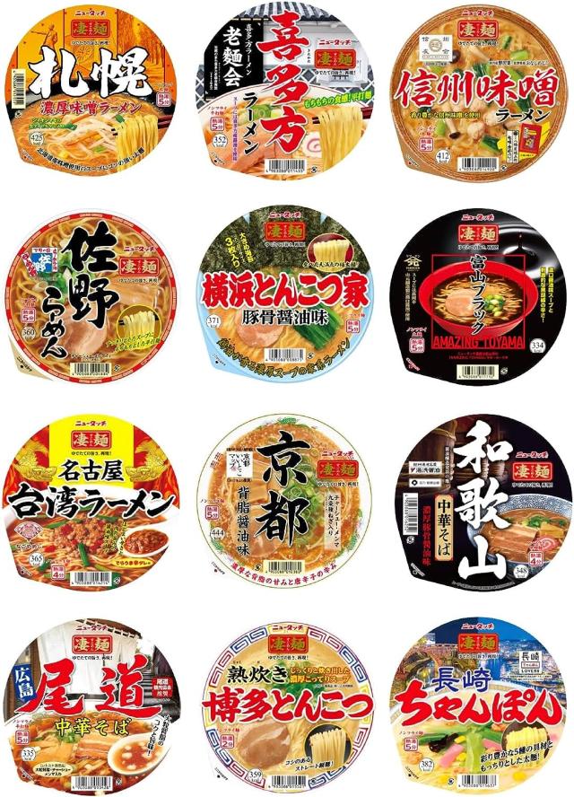 ヤマダイ、ニュータッチ、凄麺ご当地ラーメンシリーズのあまり売り場にない商品を集めたレアもの12食セットです。