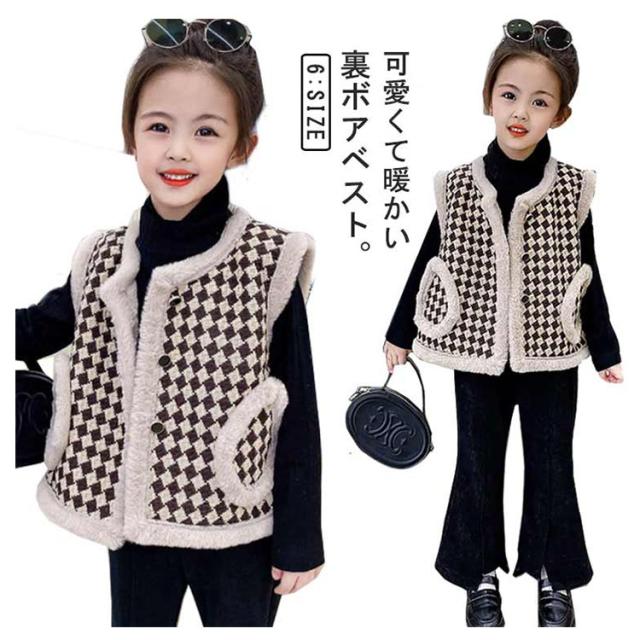 | 可愛くて暖かい裏ボアベスト。 トレンドがチェック柄を採用しております。 ノーカラーデザインなのでハイネックインナーと好相性。 サイズは90cmから140cmまで選べて、秋から春まで大活躍する一枚。 | |