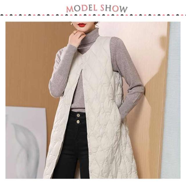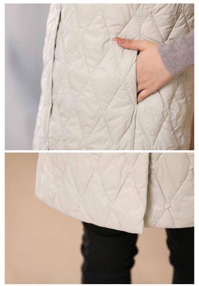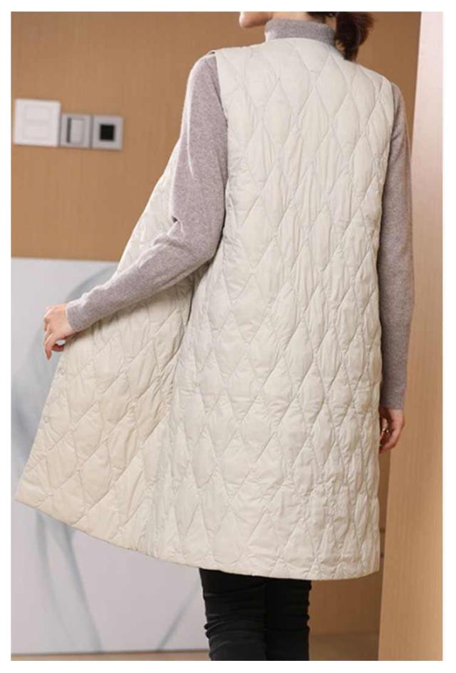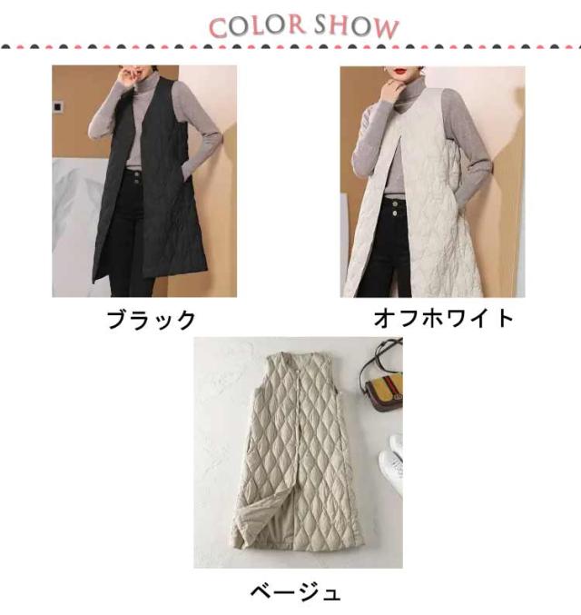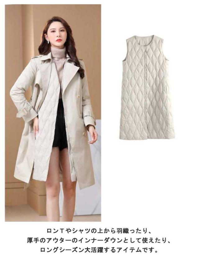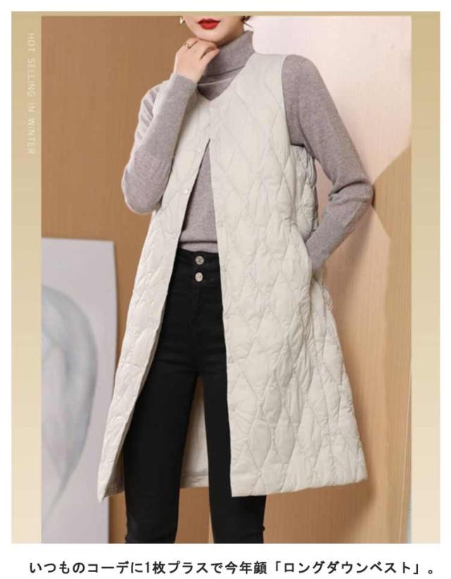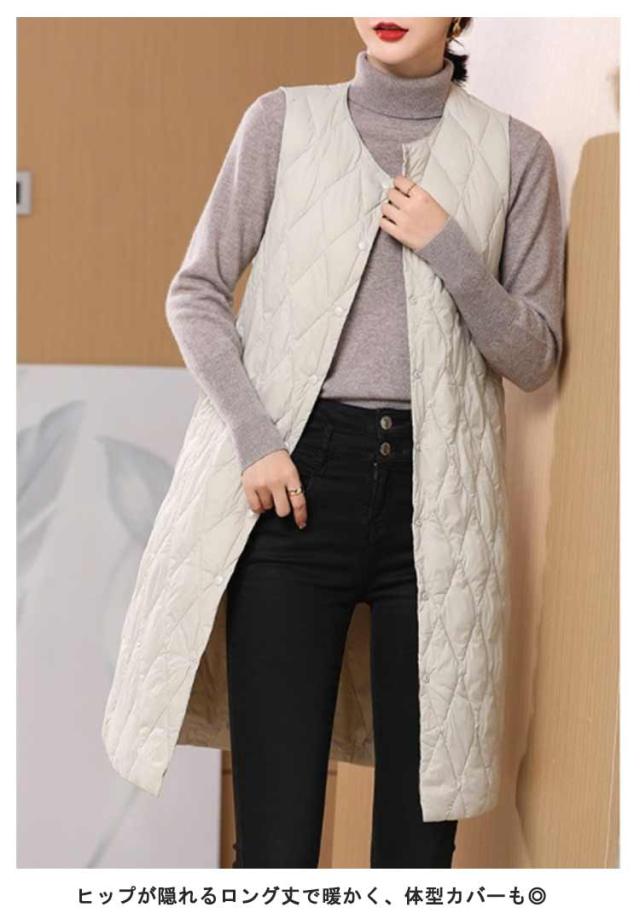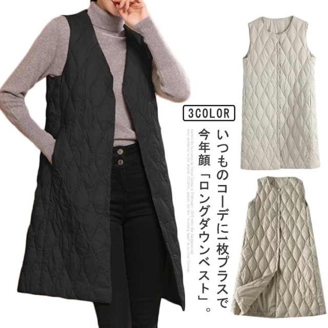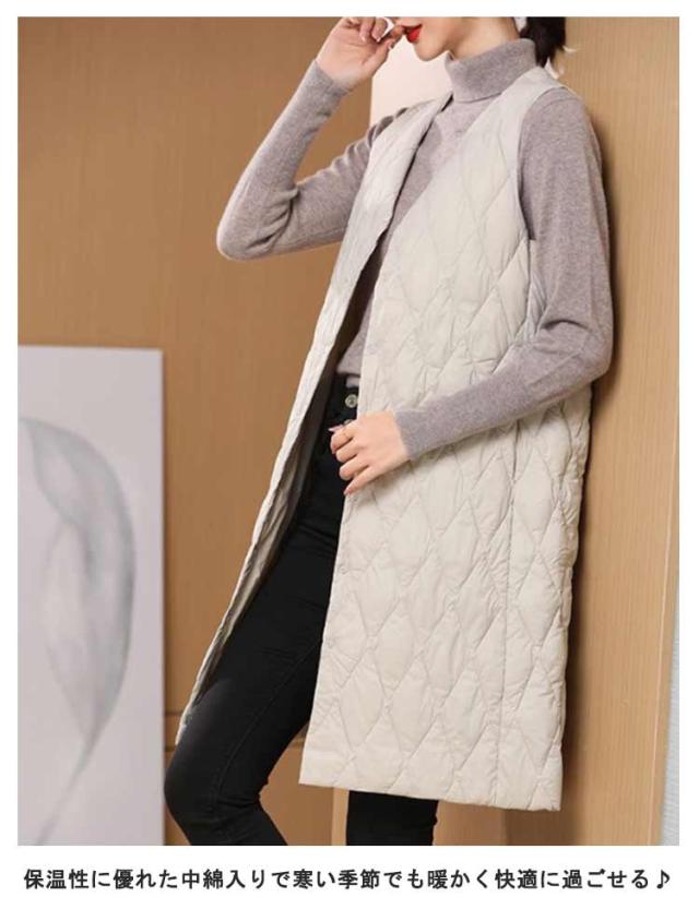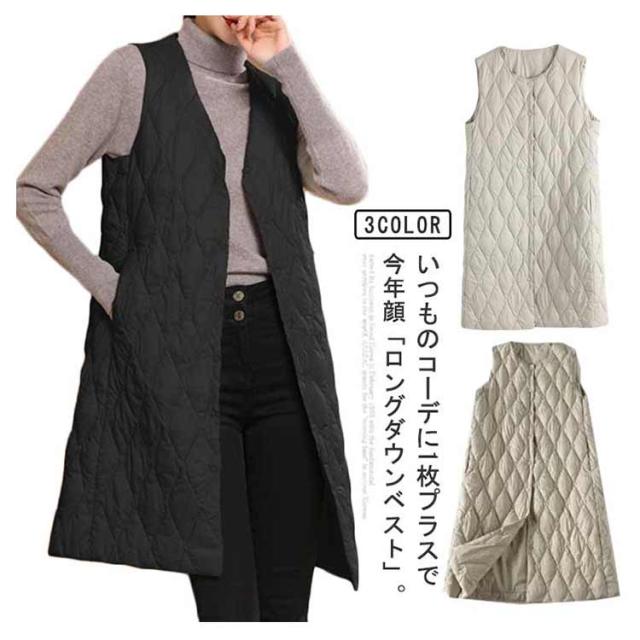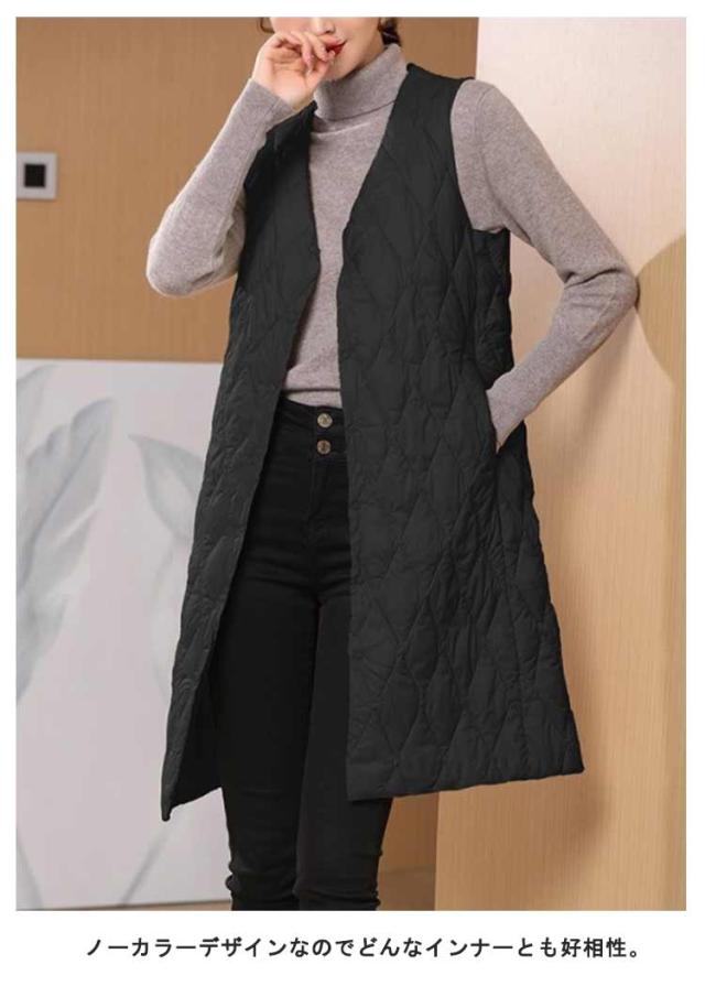 ノーカラー レディース 体型カバー ロングダウンベスト 中綿ベスト 軽量 暖かい ロング丈 ジャケット ライトダウン ダウンコート 羽織り インナーダウン 無地 大きいサイズ 秋冬 防寒対策 通勤 撥水加工 ロングダウンベスト 大きいサイズ
