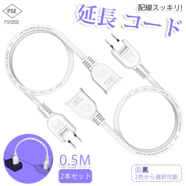 【2本セット】【新発売 送料無料】延長コード 0.5m 1個口 ブラック ホワイト 50cm 15A 1500W 耐トラッキング 絶縁キャップ ACアダプター すっきり接続 コンセント ちょっとコード ソフト 短い 電源コード 延長ケーブル 連結可 電源ケーブル 電源プラグ おしゃれ 業務用 作業用