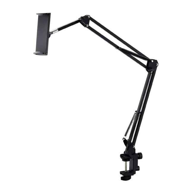 【 仕様 】 ■材質:ABS、スチール、アルミニウム、シリコン ■外形寸法:アーム部全長:約860mm、クランプ奥行:40mm、クランプ対応板厚:40mm ■重量:約570g ■カラー:ブラック ■対応機種:4.6~12.9インチのスマートフォン、タブレット(W約215mm×D約10mm×H約281mmまで) ■耐荷重:約1kg ■角度調節:○
