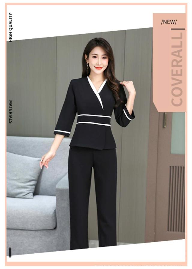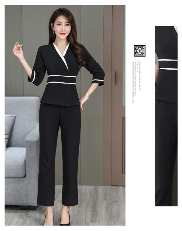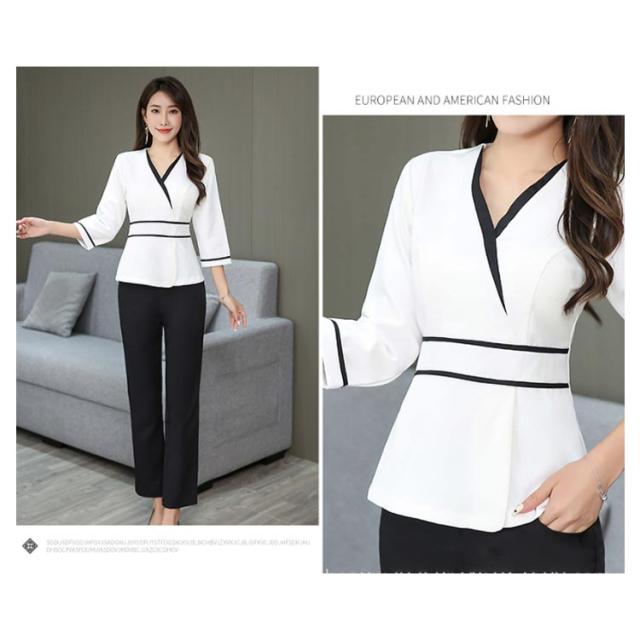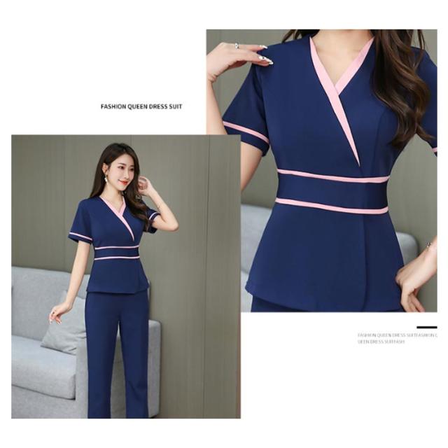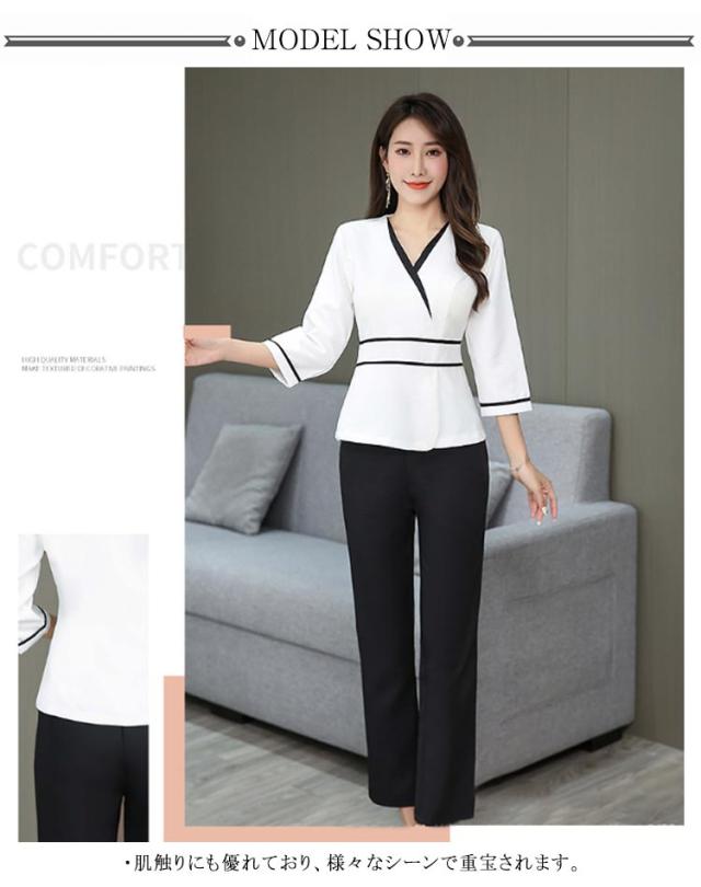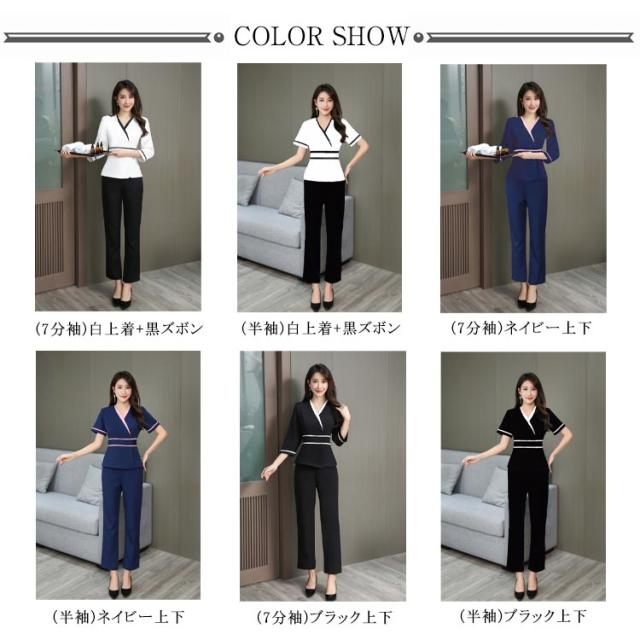 クリニック サロン エステ レディース 細身 タイト ユニフォーム スーツ クロップドパンツ 半袖 ブラウス パンツ Vネック スリム 上下セット ネイル ウェストシェイプ サロンウェア 制服 サロン エステ 美容鍼灸 整体 マッサージ スパ 温泉