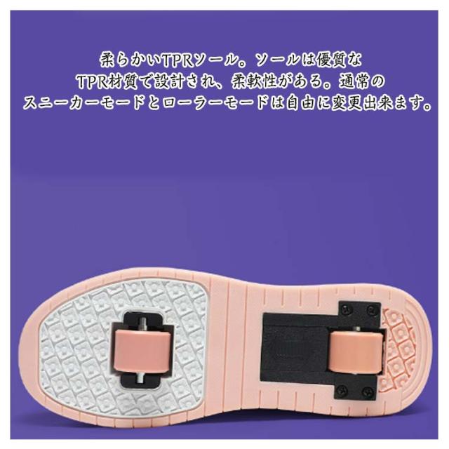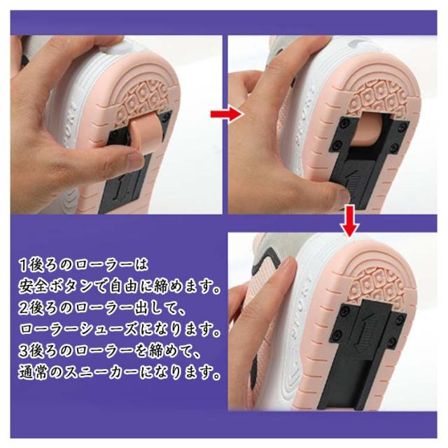 | 22-26cm!大人気のジュニアローラーシューズです。 柔らかい快適な生地。柔軟PU+メッシュ材質採用、通気性が高い、快適なアッパー、シンプルでオシャレなデザインです。 インナーは通気性に富んだファブリック素材で快適な履き心地。 柔らかいTPRソール。ソールは優質なTPR材質で設計され、柔軟性がある。通常のスニーカーモードとローラーモードは自由に変更出来ます。 1ローラーと靴の間の隙間にレンチを入れで、 ローラーを持ち上げます。 2取り外したローラーを片付けて、必要の時まだ使用します。 3予備なゴム栓を使って、穴を埋めます。 1後ろのローラーは安全ボタンで自由に締めます。 2後ろのローラー出して、ローラーシューズになります。 3後ろのローラーを締めて、通常のスニーカーになります。 | |