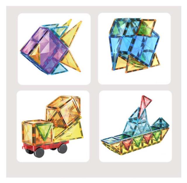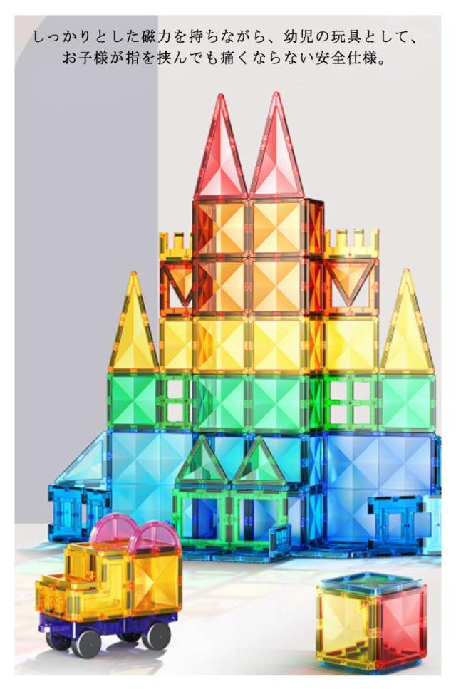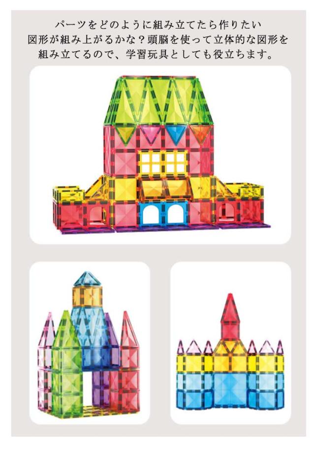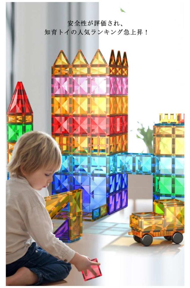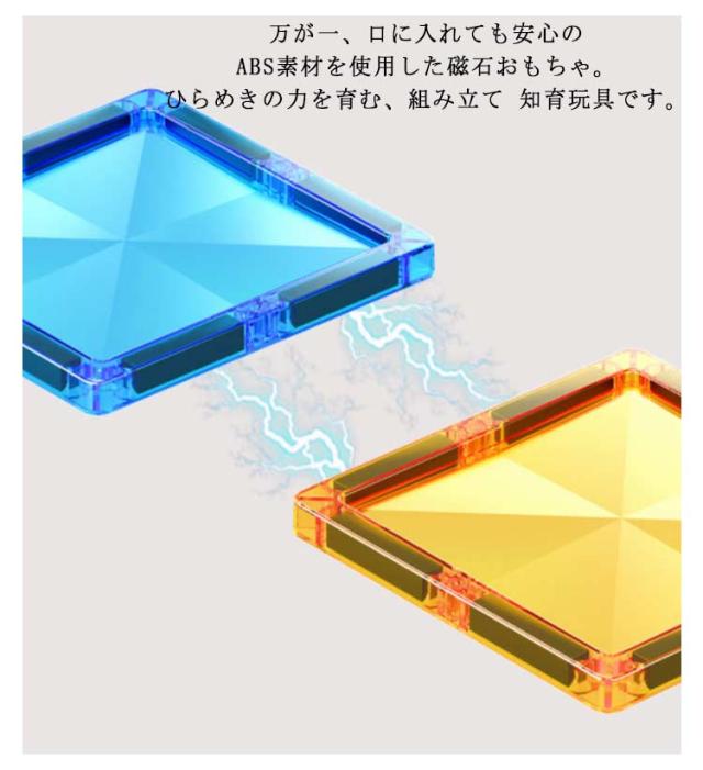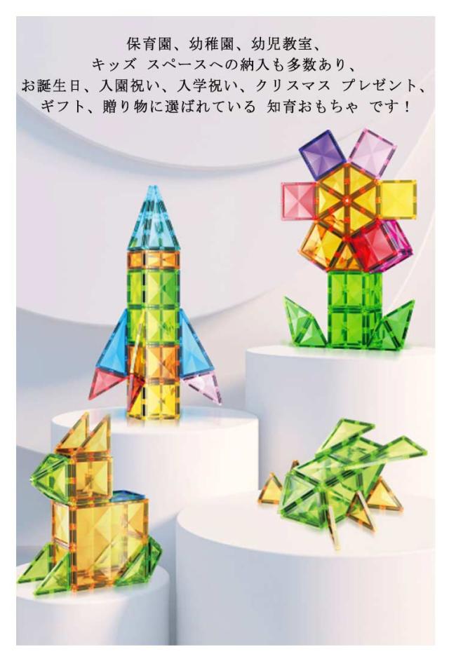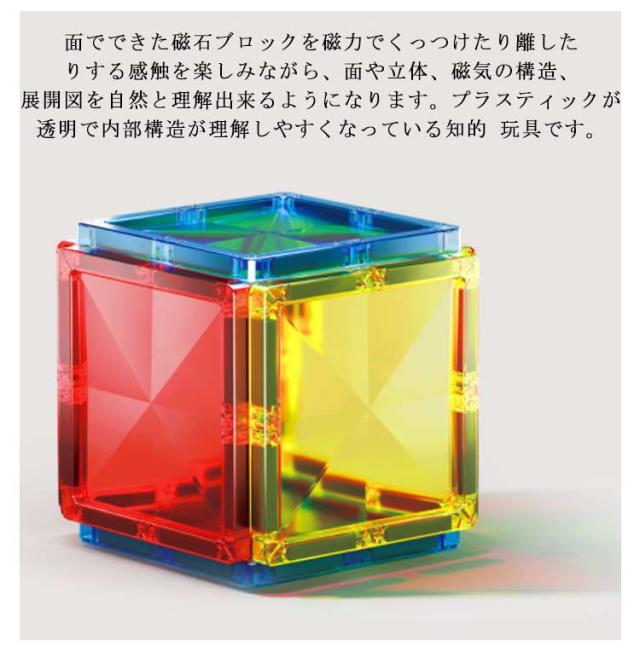 | しっかりとした磁力を持ちながら、幼児の玩具として、お子様が指を挟んでも痛くならない安全仕様。万が一、口に入れても安心のABS素材を使用した磁石おもちゃ。ひらめきの力を育む、組み立て 知育玩具です。 安全性が評価され、知育トイの人気ランキング急上昇!保育園、幼稚園、幼児教室、キッズ スペースへの納入も多数あり、お誕生日、入園祝い、入学祝い、クリスマス プレゼント、ギフト、贈り物に選ばれている 知育おもちゃ です! 面でできた磁石ブロックを磁力でくっつけたり離したりする感触を楽しみながら、面や立体、磁気の構造、展開図を自然と理解出来るようになります。プラスティックが透明で内部構造が理解しやすくなっている知的 玩具です。 パーツをどのように組み立てたら作りたい図形が組み上がるかな?頭脳を使って立体的な図形を組み立てるので、学習玩具としても役立ちます。 | |