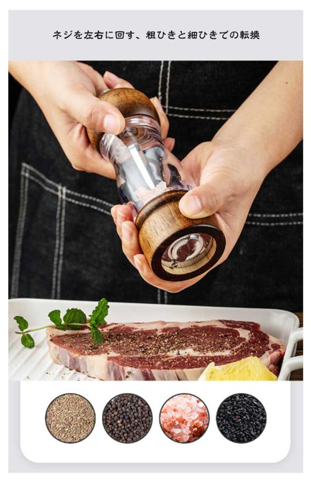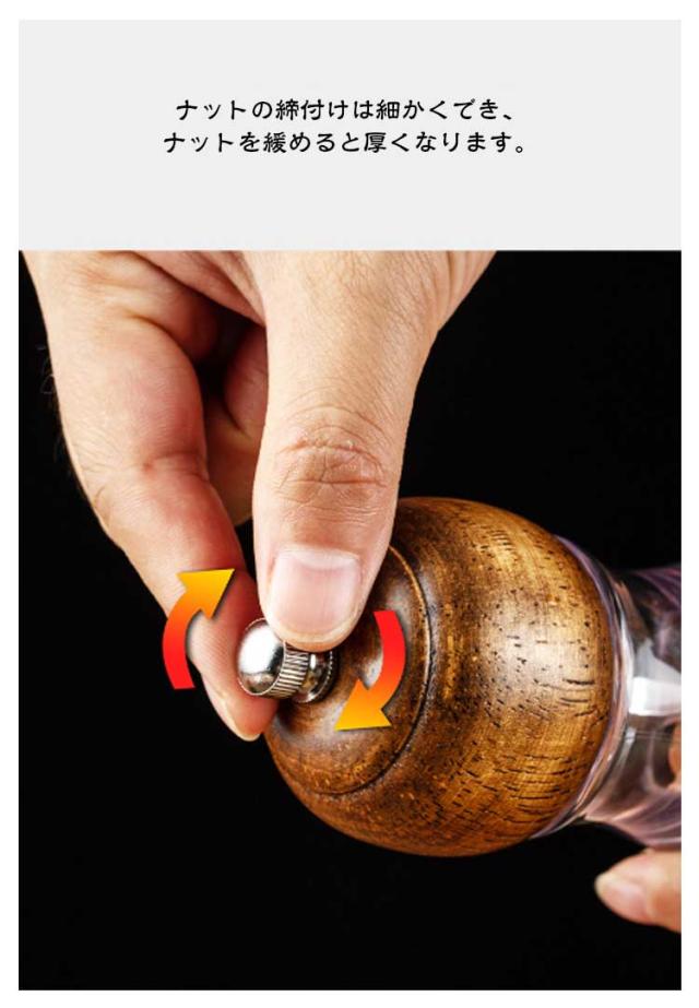 | 胡椒ひき ネジを左右に回す、粗ひきと細ひきでの転換 ナットの締付けは細かくでき、ナットを緩めると厚くなります。 天然オーク木製+陶器研削コア 耐久性がある 簡単な料理、心を込めて、食事は上手くできる | |