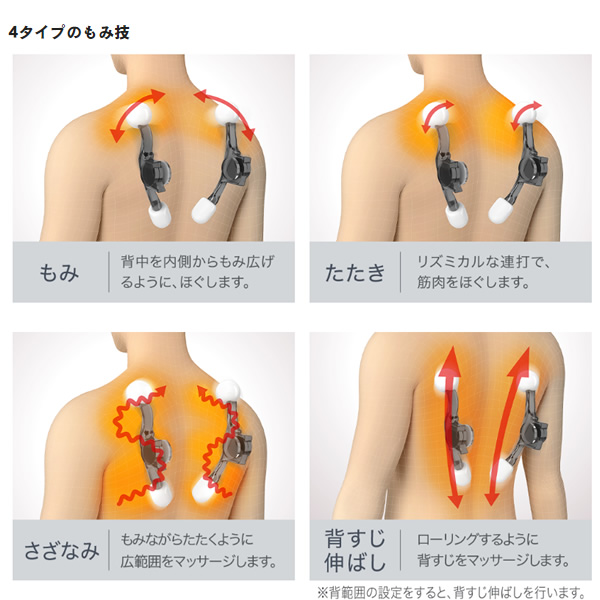 4つのもみ玉が左右・上下・前後に駆動し、首、肩、背、腰の筋肉にフィットして深くアプローチ。パワフルなもみ心地でマッサージします。