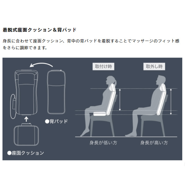 身長に合わせて座面クッション、背中の背パッドを着脱することでマッサージのフィット感をさらに調節できます。