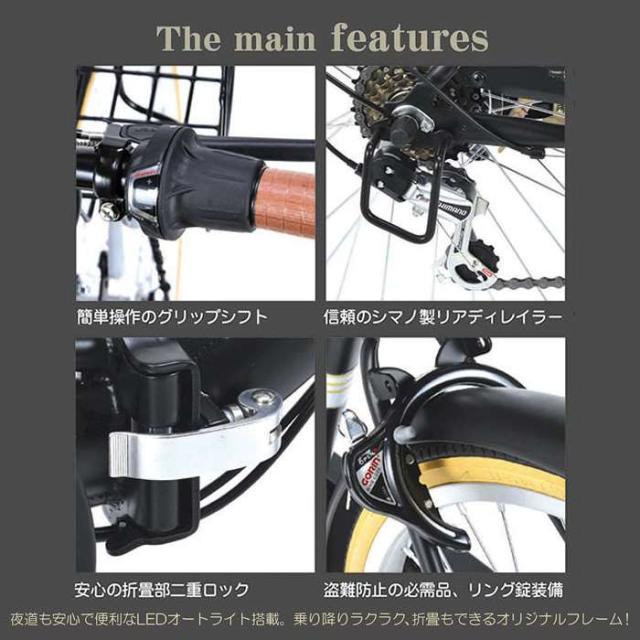 折畳自転車26インチ上品なスタイルで乗りやすいループフレーム。機能性も抜群のファッショナブルサイクル。上品なスタイルで乗りやすいループフレーム。折畳機能もついてクルマに積んだり、収納もラクラク。暗くなると自動で点灯! 便利なLEDオートライト装備。シマノ製6段ギア搭載でどこでも快適走行。※自転車は100%完成車ではございません。(完成率90%〜95%)。※写真はイメージの為、実物とは多少異なる場合がございます。また、予告なくデザイン、仕様、カラーなどが一部変更となる場合がございます。※組立品の為、ブレーキ、変速機等は完全な調整はできておりませんので調整が必要な場合は取り扱い説明書にて調整をお願いしております。※適応身長150cm〜、適応体重75Kg以下。メーカー推奨適応体重を越えられる方がご使用された場合は製品保証対象外となります。※ご使用前は必ずエアチェックをしてください。