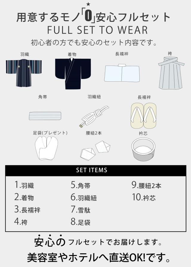\初めてでも安心!足袋まで付いた安心のフルセット/和×モダンなデザインの羽織袴フルセットです。卒業式の男児用の袴です。BLACK / WHITEの2色からお選び頂けます。忙しいご両親にも嬉しいフルセット、往復送料は無料です(一部地域除く)。ご希望のご着用日を選んで注文するだけで、商品がお手元に届きます。返送は専用着払い伝票で、お近くの運送会社まで依頼するだけ。ネットだから実現できたここまでのコスト削減!美容室、ホテル等へのお届けも可能です(送付先に指定してください)●適応身長 約150cm〜約160cm●寸法 : 羽織丈 : 約84cm ・羽織裄 : 約68cm ・袴紐下 : 約85cm ※簡単なサイズ調整が必要な場合があります。●セット内容 羽織・着物・長襦袢・袴・角帯・羽織紐(チェーンタイプ) 雪駄・腰紐2本・衿芯・足袋(プレゼント)・・・計10点●素材:ポリエステル100%