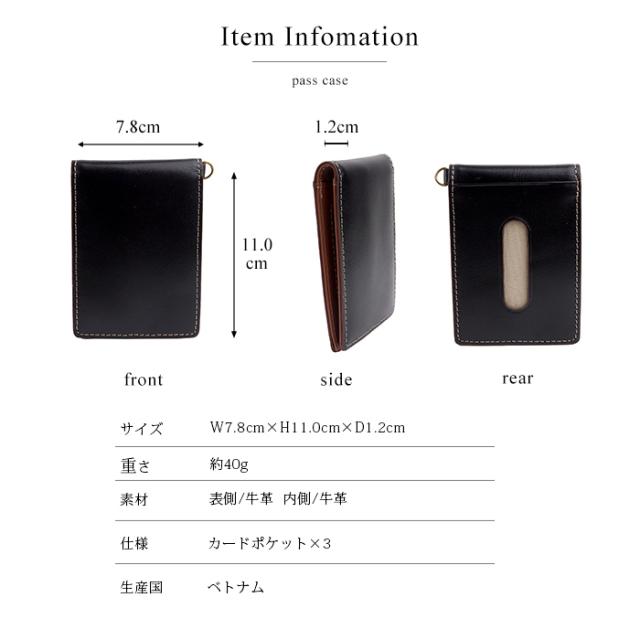 上品な艶のある落ち着いた色合いを持った天然牛革を使用したベーシックなデザインの二つ折りパスケース