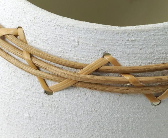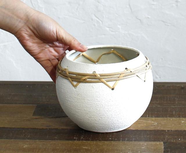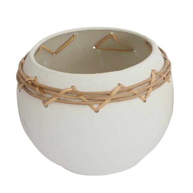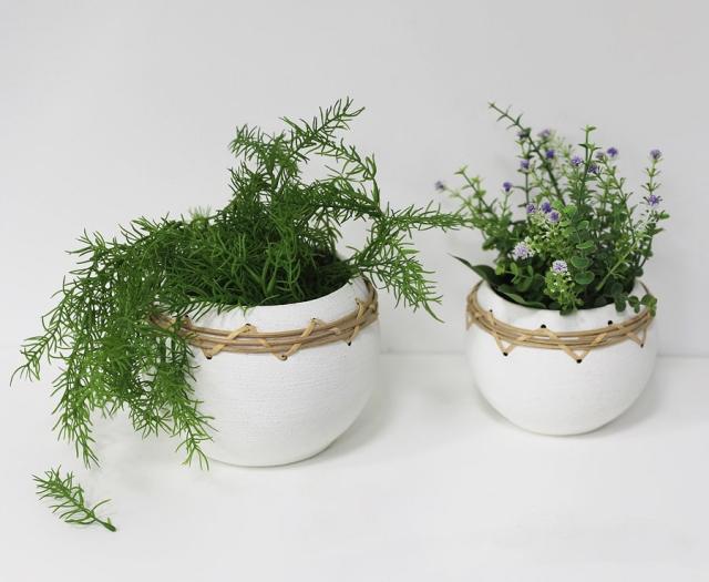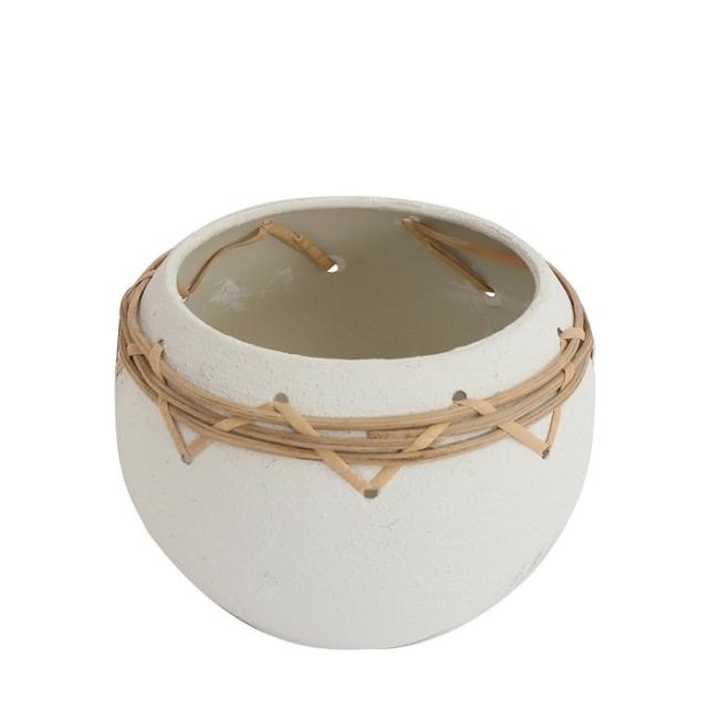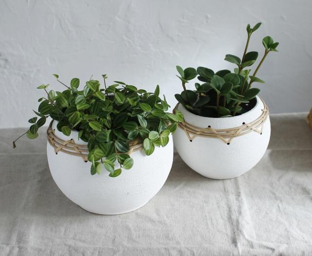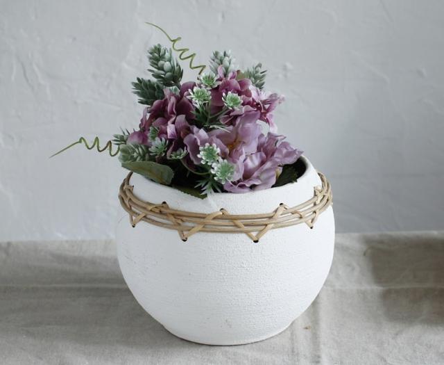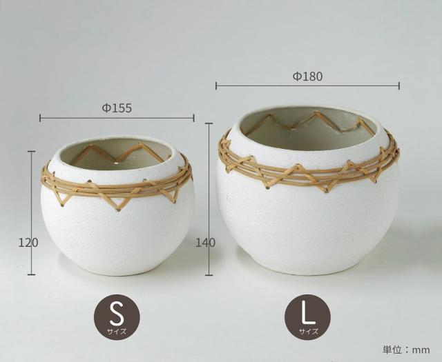 無骨なアイアン素材、爽やかな白色に籐装飾で表情が和らぐ。シャビー(古びた)でシック(お洒落で上品)な、がコンセプトの新シリーズ。お好みの植物を入れるとシンプルさと植物がよく馴染む、清潔感のある爽やかな白色、ぽってりとした形状が可愛く魅力的♪