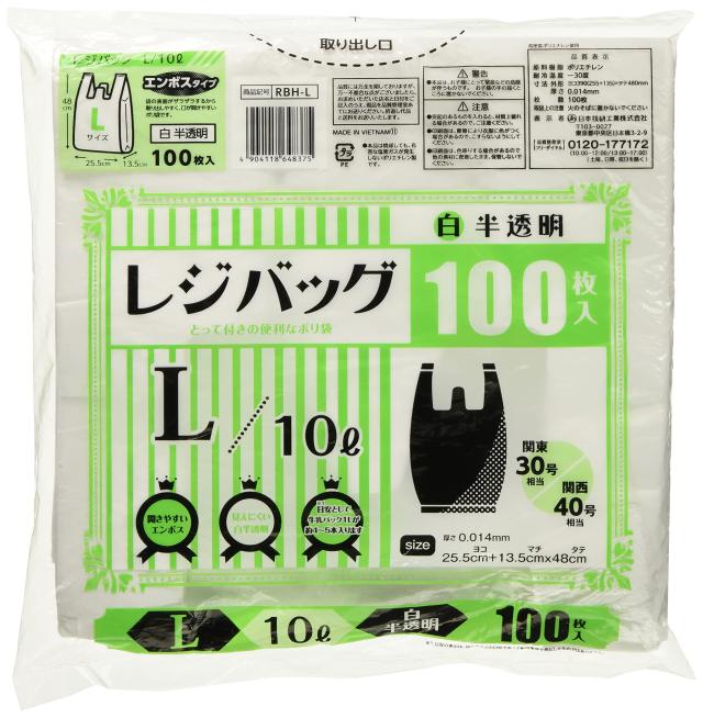 日本技研工業 レジバッグ 白半透明 L エンボス加工 100枚 幅25.5×奥行(マチ)13.5×高さ48cm 0.014mm ゴミ袋 ポリ袋