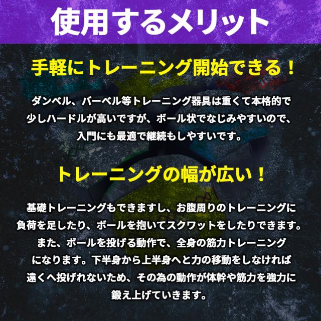 スクワット、プッシュアップ、シットアップなどの筋力トレーニングに負荷をかけるために利用したり、投げる、持つ、掴むなどのボールを使うような動作で全身のトレーニングが可能です。複数人でのトレーニングにもおすすめです。