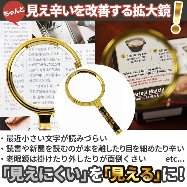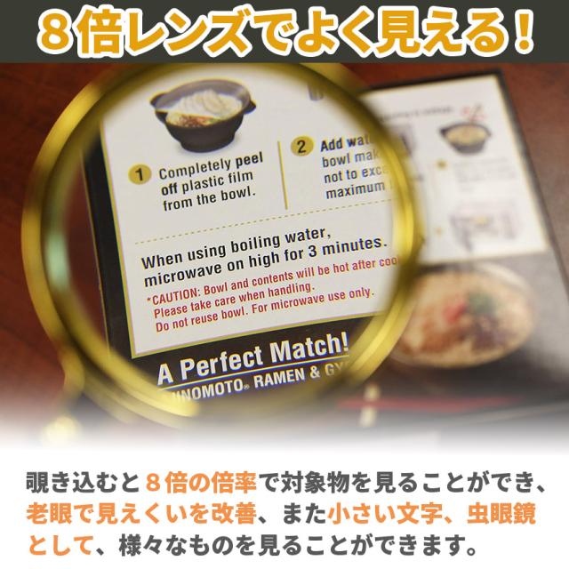 黒と金の装飾品のような珍しいデザインですけど、ちゃんと8倍の拡大鏡です!虫眼鏡として昆虫観察や自然でのご使用、読書や新聞、文字を読むなどのルーペとしてとっても便利!