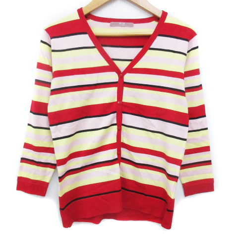 【中古】インタープラネット ニットカーディガン 薄手 ミドル丈 七分袖 マルチボーダー柄 40 赤 黒 レディース