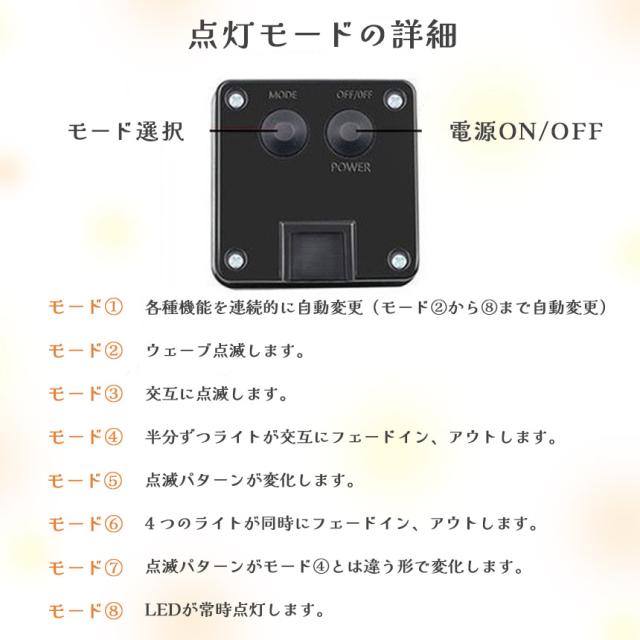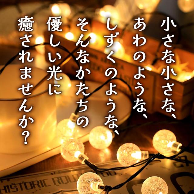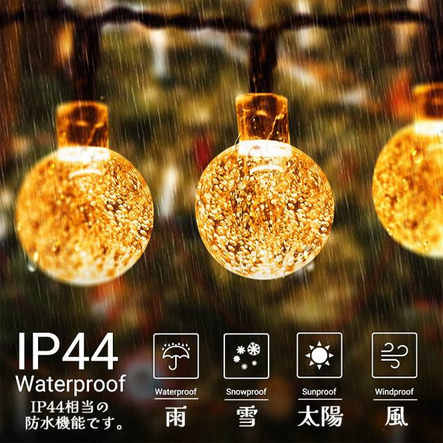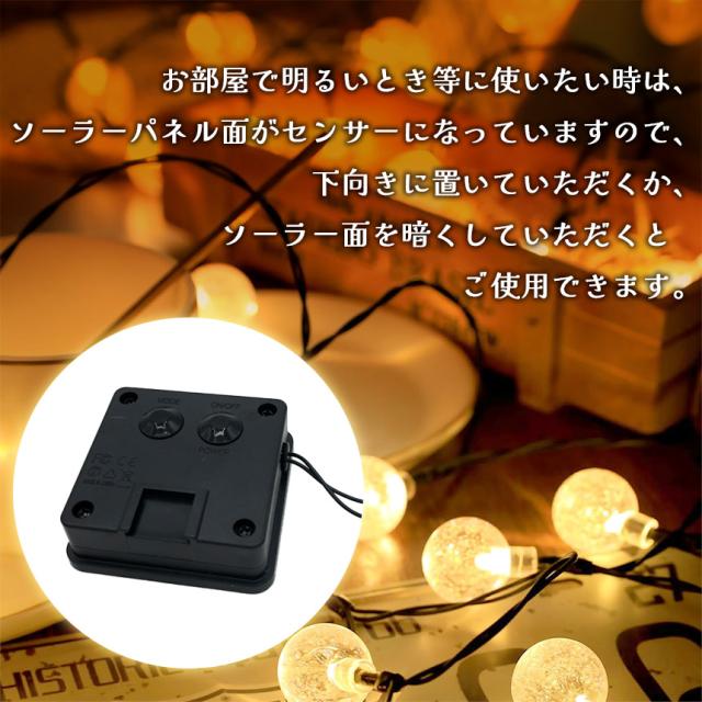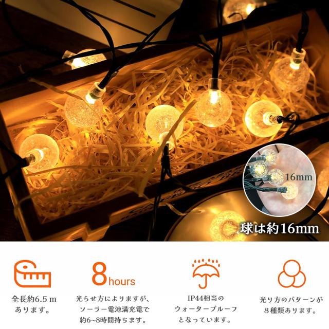 【球の大きさ約16mmのかわいいソーラーLEDイルミネーション】とってもかわいく8パターン選べて光るイルミネーション♪ソーラータイプ&センサーで自動点灯、消灯してくれる優れもの。クリスマスシーズンはもちろん、四季を問わず心まで優しく照らしてくれます♪【防水防雨IP44仕様】ソーラー充電式ですので、屋外コンセントの有無に左右されません。IP44の防滴なのである程度の天気でもご使用になれます。(強風強雨に耐えうるまではありません。)【自動点灯・消灯】ソーラー充電式のため電気代はかからず省エネでエコです。また、照度センサーで暗くなったら自動点灯し、明るくなると消灯・充電をします。
