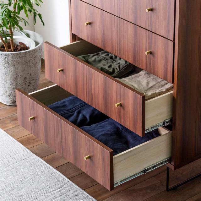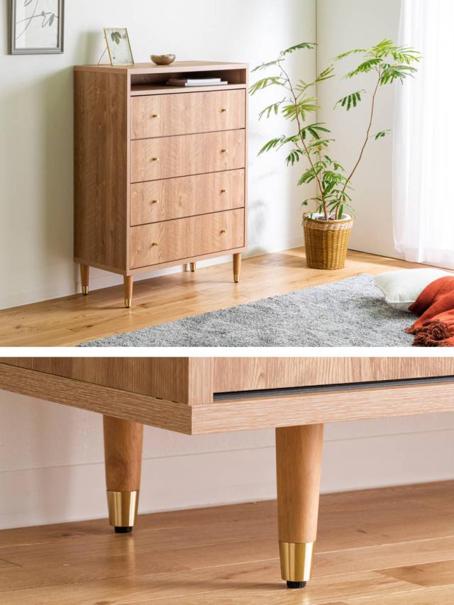リアルさを追求した自然な木目柄が特徴のハイチェストです。細部まで美しい高級感のあるデザインで、お部屋をワンランク上の空間にしてくれます。デザイン性だけでなく4杯の引出しと収納棚つきで収納力もしっかり兼ね備えています。カラーはナチュラルとブラウンの2種類があります。