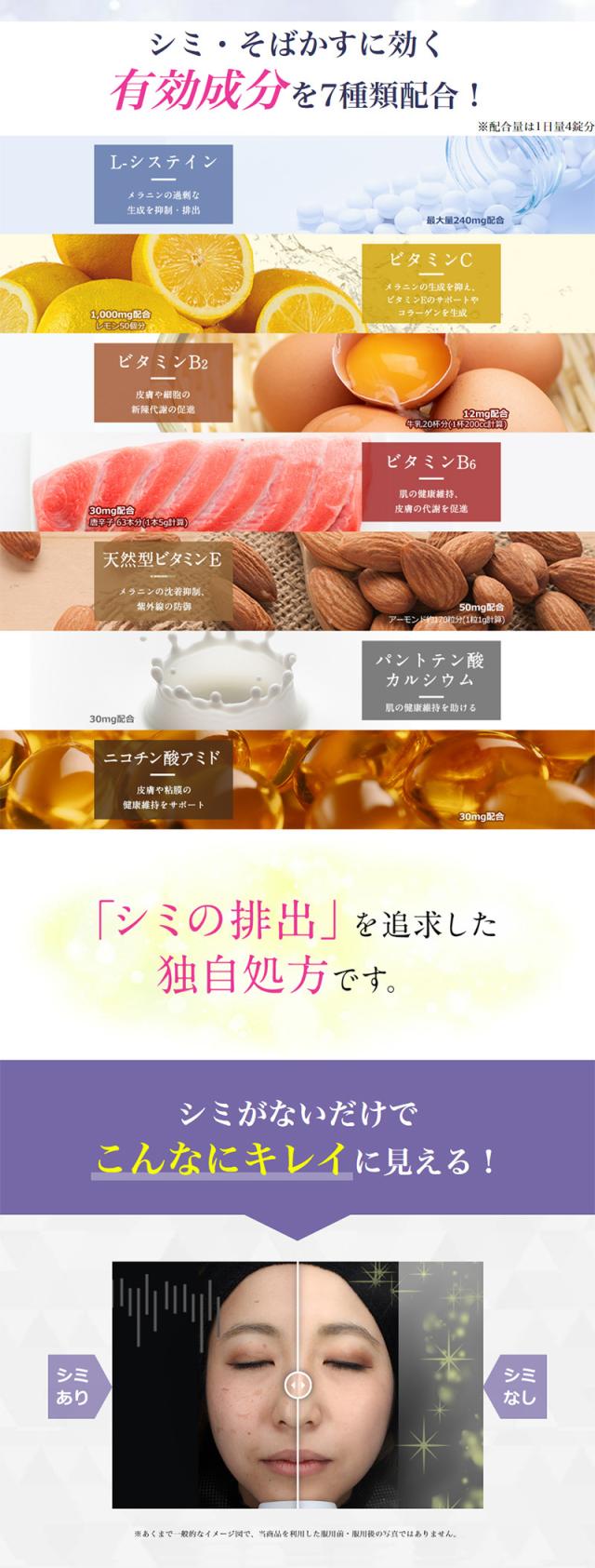 | 成分・分量 | 1日量(4錠中) アスコルビン酸(ビタミンC)……1000mg L-システイン……240mg リボフラビン(ビタミンB2)……12mg ピリドキシン塩酸塩 (ビタミンB6)……30mg トコフェロールコハク酸エステルカルシウム(ビタミンEコハク酸エステルカルシウム)……51.89mg (dl-α-トコフェロールコハク酸エステルとして50mg) ニコチン酸アミド……30mg パントテン酸カルシウム……30mg [添加物] 添加物として、乳酸Ca、トウモロコシデンプン、セルロース、クロスポビドン、ヒドロキシプロピルセルロース、アルファー化デンプン、ステアリン酸Mg、ヒプロメロース、酸化チタン、タルクを含有します。 [成分・分量に関連する注意] (1)本剤の服用により、尿及び大便の検査値に影響を与えることがあります。これらの検査を受ける場合は、ビタミンCを含有する製剤を服用していることを医師に知らせてください。 (2)本剤はリボフラビン(ビタミンB2)を含有するため、本剤の服用により、尿が黄色くなることがあります。 |