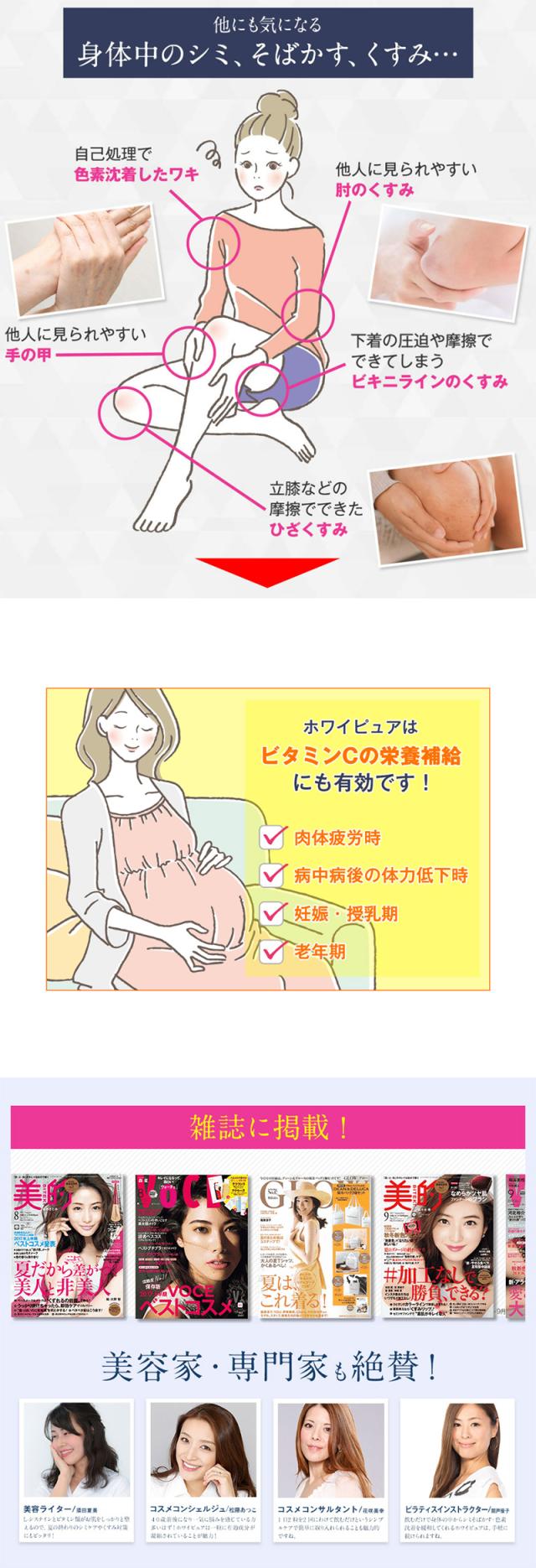 | 効能・効果 | 〇次の諸症状の緩和:しみ、そばかす、日やけ・かぶれによる色素沈着 〇次の場合の出血予防:歯ぐきからの出血、鼻血 「ただし、これらの症状について、1ヵ月ほど使用しても改善がみられない場合は、医師、薬剤師又は歯科医師に相談すること。」 〇次の場合のビタミンCの補給:肉体疲労時、妊娠・授乳期、病中病後の体力低下時、老年期 |