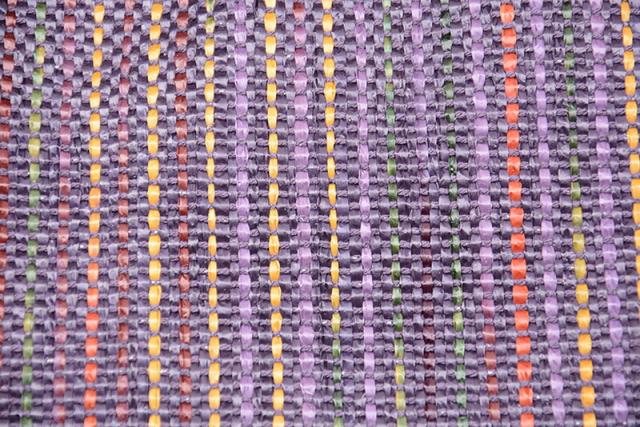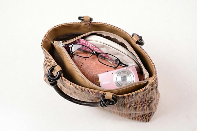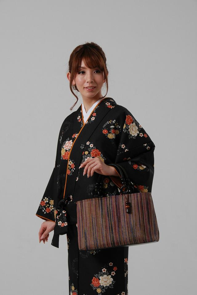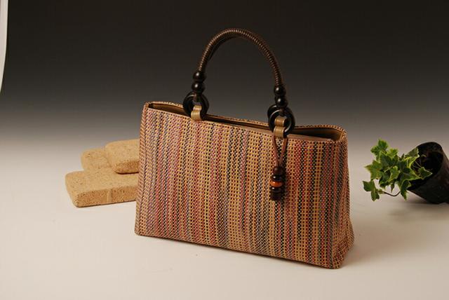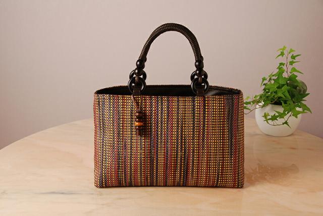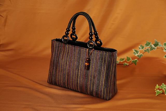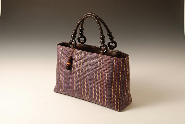 *糸1本を3色で染める(段染め)た糸を2本使い、6色の美しい色を織り上げた生地で作ったバッグ。