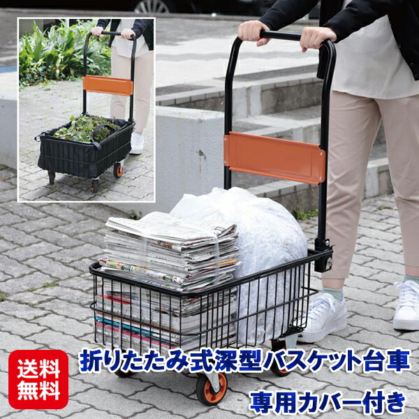段差 台車 カゴ付き 折りたたみ 持ち手 カバー 荷物 運び ゴミ出し 【折りたたみ式深型バスケット台車 専用カバー付き】 【送料無料】 バスケット台車 深 60kg ゴミ捨て 買い物 ファミラ sd