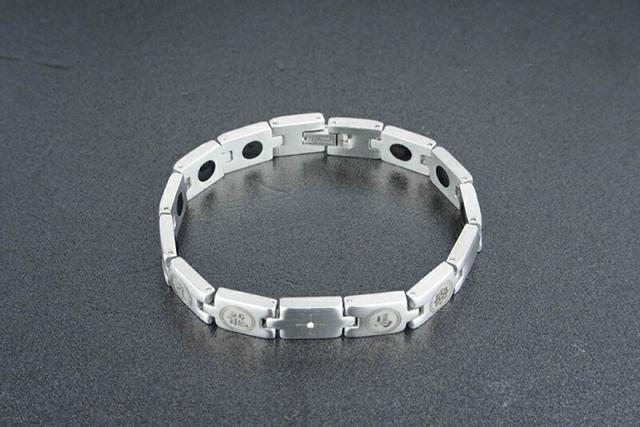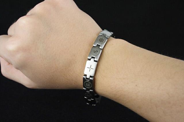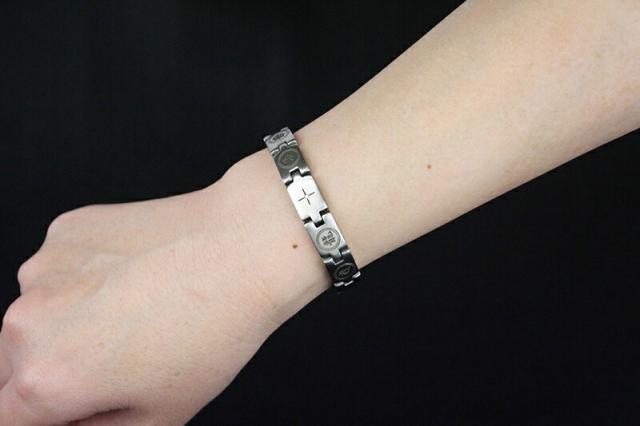 *坂本龍馬に因んだブレスレットを作りました。素材には錆びにくいステンレスを使い、中心になるプレートのまん中にダイヤモンドをセットし、そのプレートの両脇に龍と馬の文字を入れ、さらに両側に大日如来の梵字と坂本龍馬の家紋を彫り込みました。