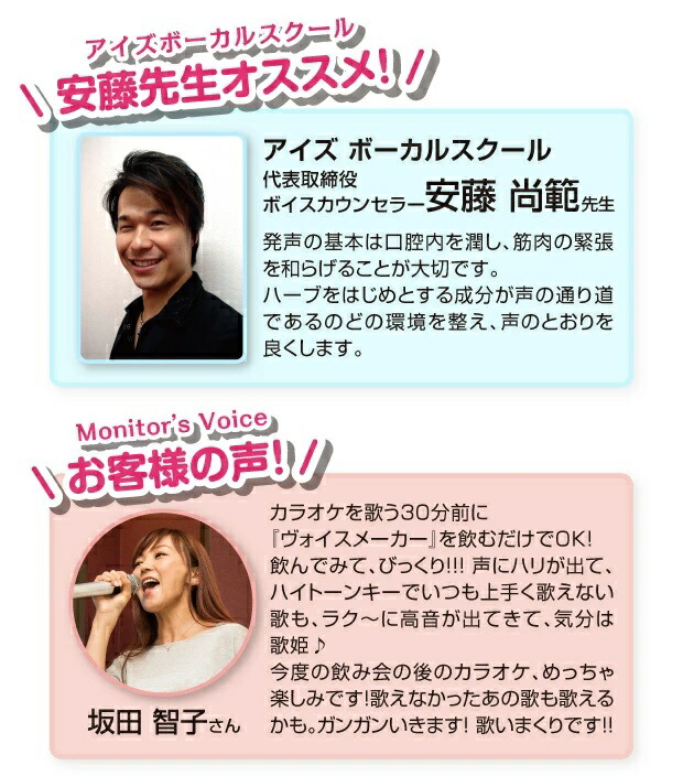 また、声帯を柔軟にさせることで発声の通り道であるのどをうるおし、声にハリや伸びのある美声に導きます。