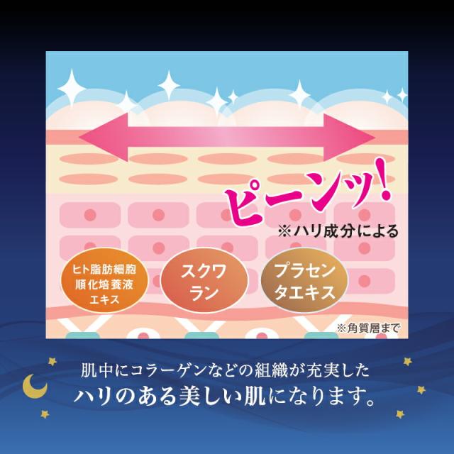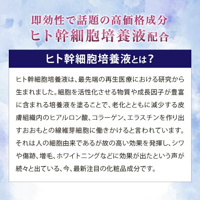 成 分: ヒト脂肪細胞順化培養液エキス、リンゴ酸ジイソステアリル、スクワラン、マカデミア種子油、水、プラセンタエキス、グリセリン、セラミドNP、オリーブ果実酒、水溶性コラーゲン他