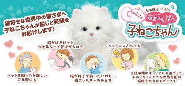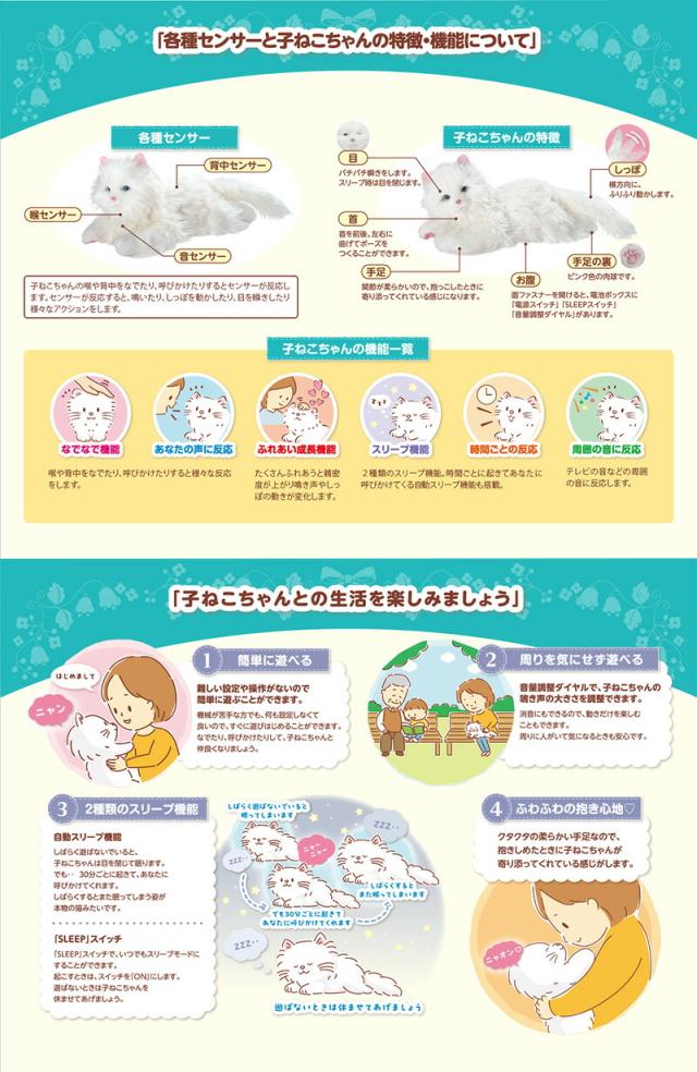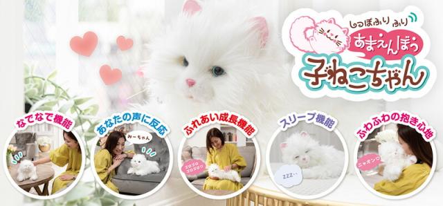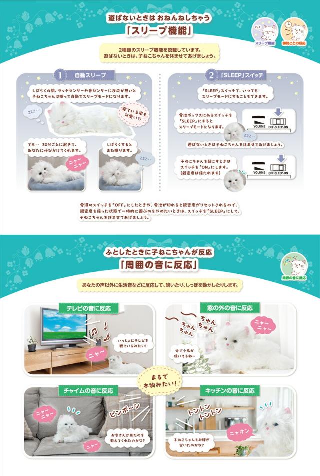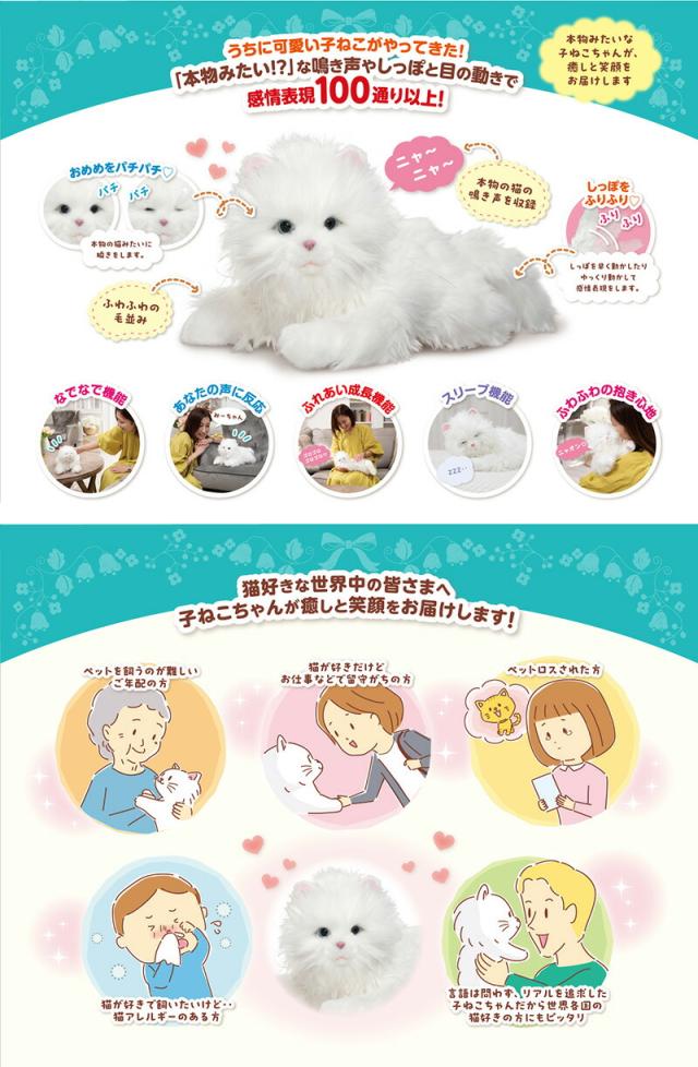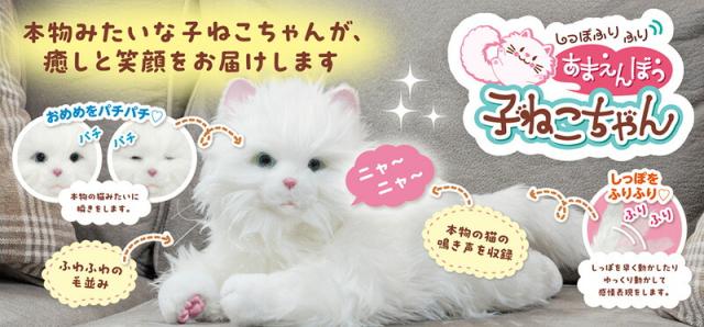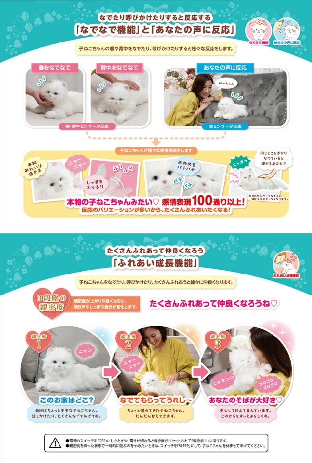 商品詳細: 本物みたいな「しっぽ」の動きと、お目目を「パチパチ」、 とっても愛らしい「鳴き声」で感情表現が豊かな、「子猫型ペットロボット」です。