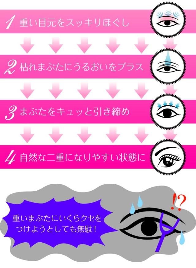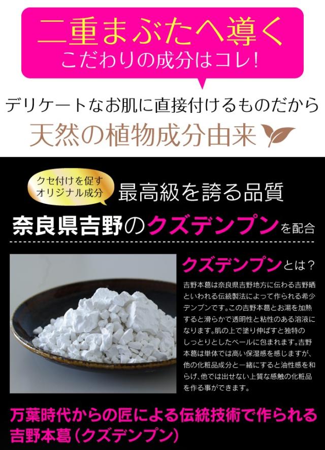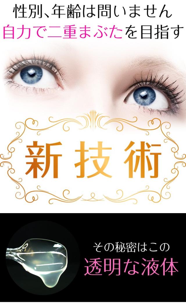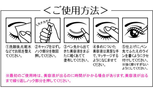 使用方法: 洗顔後、化粧水などでお肌を整えてください。キャップをはずし、ノック部分を数回押してください。 ペン先から出てきた美容液をまぶたに軽くあてて塗布してください。多めについた美容液は清潔な手でマッサージするようになじませてください。 仕上げにペン先でラインを書くようにクセ付けしてください。※強くこすり過ぎないでください。