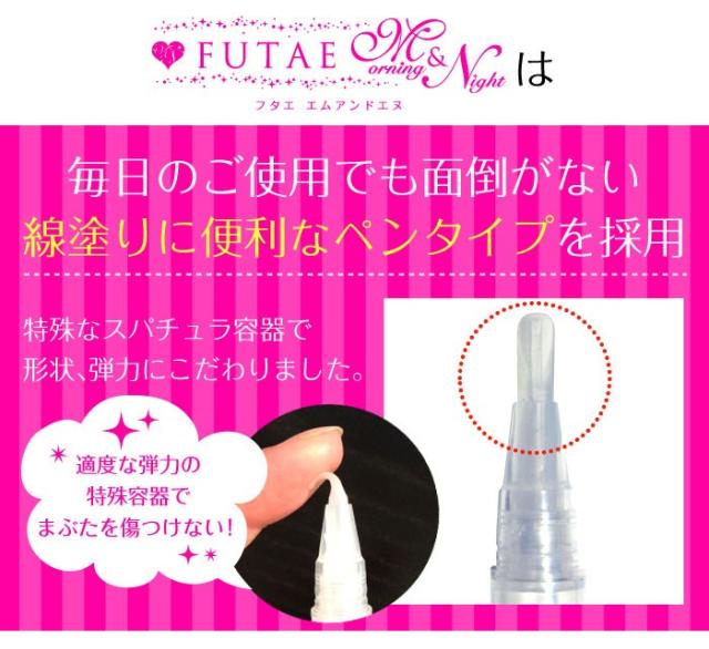 商品詳細: 重いまぶたにいくらクセをつけようとしても無駄!FUTAE M&Nは、土台となる目元からチェンジ!二重へのクセ付け度をUP! 二重まぶたへ導くこだわりの成分を配合!デリケートなお肌に直接つけるものだから天然の植物成分由来。ハリ、ツヤ、透明感、スッキリまぶたを目指せる! のりタイプやシールタイプの二重コスメとは全く違う、美容成分たっぷりの目元用美容液。 まぶたの状態を整える為、まぶたスッキリ美容成分、まぶたうるおい成分、まぶた引き締め成分を贅沢に配合。 毎日の使用でも負担がなく安心!毎日のご使用でも面倒がない、線塗りに便利なペンタイプを採用!デリケートなまぶたを傷つけません! とろり透明な液体を朝と夜、二重を書くように塗るだけの二重まぶた用美容液です。