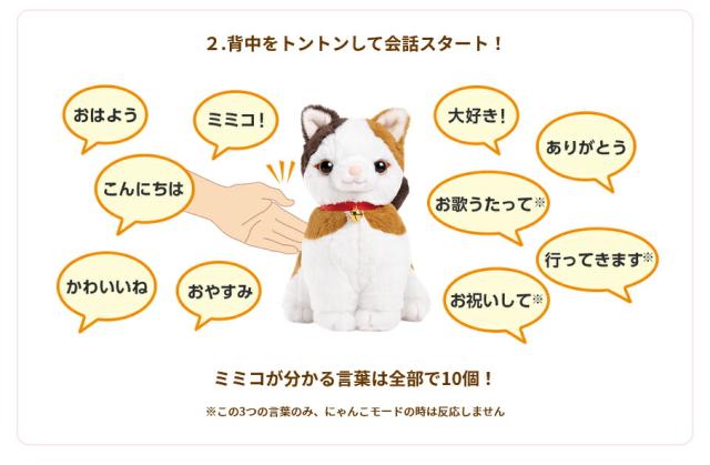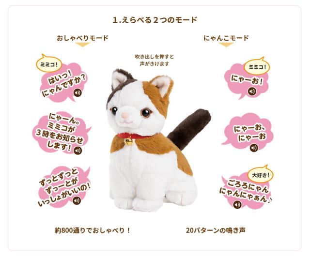 特 徴: ●本当の子供の声と本当の猫の声で会話をできる音声認識人形 ●初期設定不要の簡単操作で誰でもすぐに楽しめます ●ミミコからも話しかけてくるので自然に会話が楽しめます ●1,000ワード以上の言葉で会話ができてお歌も30曲歌います ●思いやりあふれる言葉や生活上での注意喚起の言葉も話します
