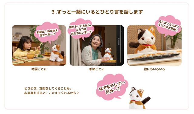 関連キーワード【ねこ ぬいぐるみ しゃべる 三毛猫 みけねこ おしゃべり人形 会話 女の子 こんにちニャン!みけねこミミコ 送料無料 ポイント 倍〜7倍 ねこちゃん グッズ みけねこ ミミコ シニア向け おしゃべりぬいぐるみ 人工知能型ロボット パートナーズ 人形 脳トレ 会話 音声認識人形 ボケ 防止 介護用品】