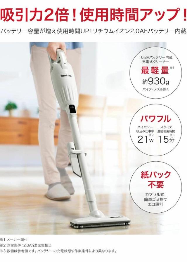 商品詳細: ●使用時間アップ:バッテリ容量が2.0Ahになり使用時間がアップ。吸込仕事率は21W。