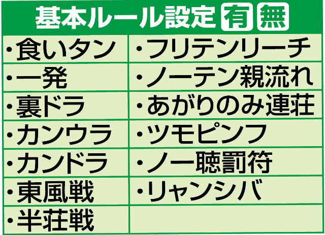 ●基本ルール設定有無:食いタン・一発・裏ドラ・カンウラ・カンドラ・東風戦・半荘戦・フリテンリーチ・ノーテン親流れ・あがりのみ連荘・ツモピンフ・ノー聴罰符・リャンシバ