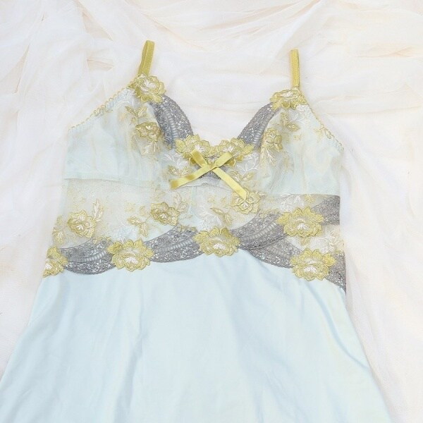身頃の切り替えレースはアシメトリーなデザインで、クロスしたレースがドレスのドレープのように繊細で優美なスタイルに。
