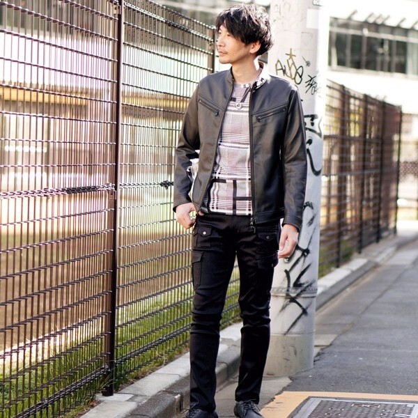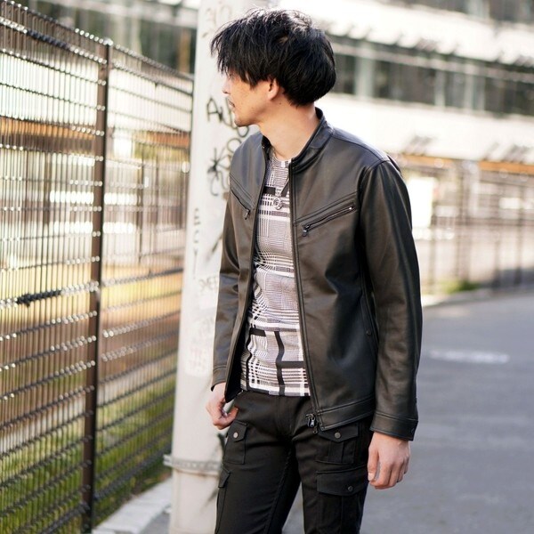 質感の良いラム調湿式合皮を使用。表面にはエンボス加工の上にムラプリントを施してリアルな陰影感を出しています。基布にカットソー素材を使用しているので伸縮性があり、着心地も抜群です。