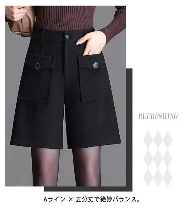 ショートパンツ 秋冬 レディース ウールタッチ 膝上丈パンツ ウール調 Aライン 五分丈 ハーフパンツ 美脚 キュロットパンツ 短パン キレイめ カジュアル ゆったり ハイウエスト 着痩せ ブラック ブラウン