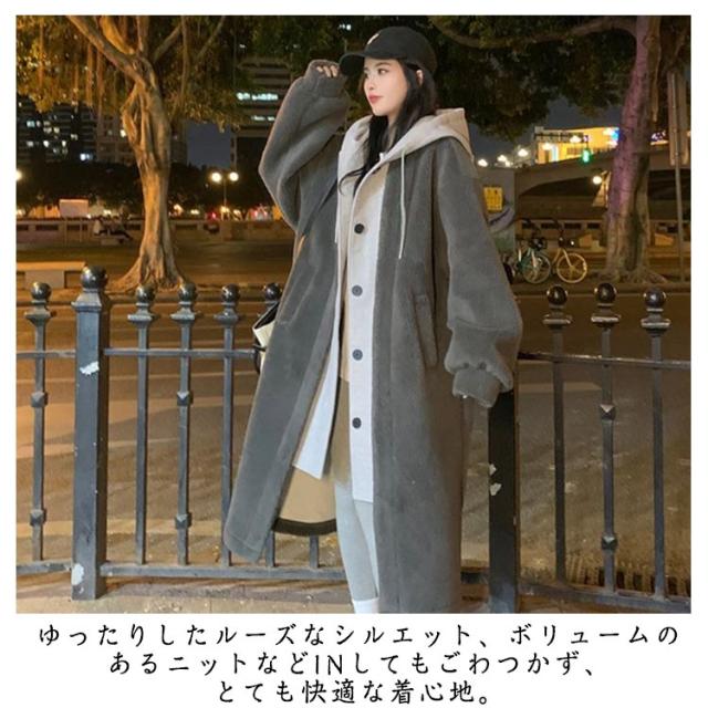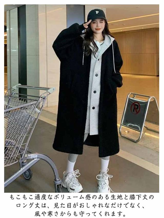 | オシャレさと防寒性を兼ね備えたボアコート。 パーカーを重ね着したようなデザイン、カジュアルなスタイルに最適。 もこもこ適度なボリューム感のある生地と膝下丈のロング丈は、見た目がおしゃれなだけでなく、風や寒さからも守ってくれます。 ゆったりしたルーズなシルエット、ボリュームのあるニットなどINしてもごわつかず、とても快適な着心地。 | |