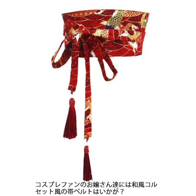 | おしゃれな和風ベルト!選べる20柄 モダンでとってもおしゃれな和風のサッシュベルトです。 まるで着物の帯と見間違える程素敵なデザインですね。 和柄プリントが全体に施された上品なデザイン。 デイリー使いにももちろん浴衣などでのアレンジを楽しんでもGOOD! フロント部分結んで着脱できるから、楽に着脱可能です。 お手持ちの帯締めも使用出来るのでイメージが変わります コスプレファンのお嬢さん達には和風コルセット風の帯ベルトはいかが? | |